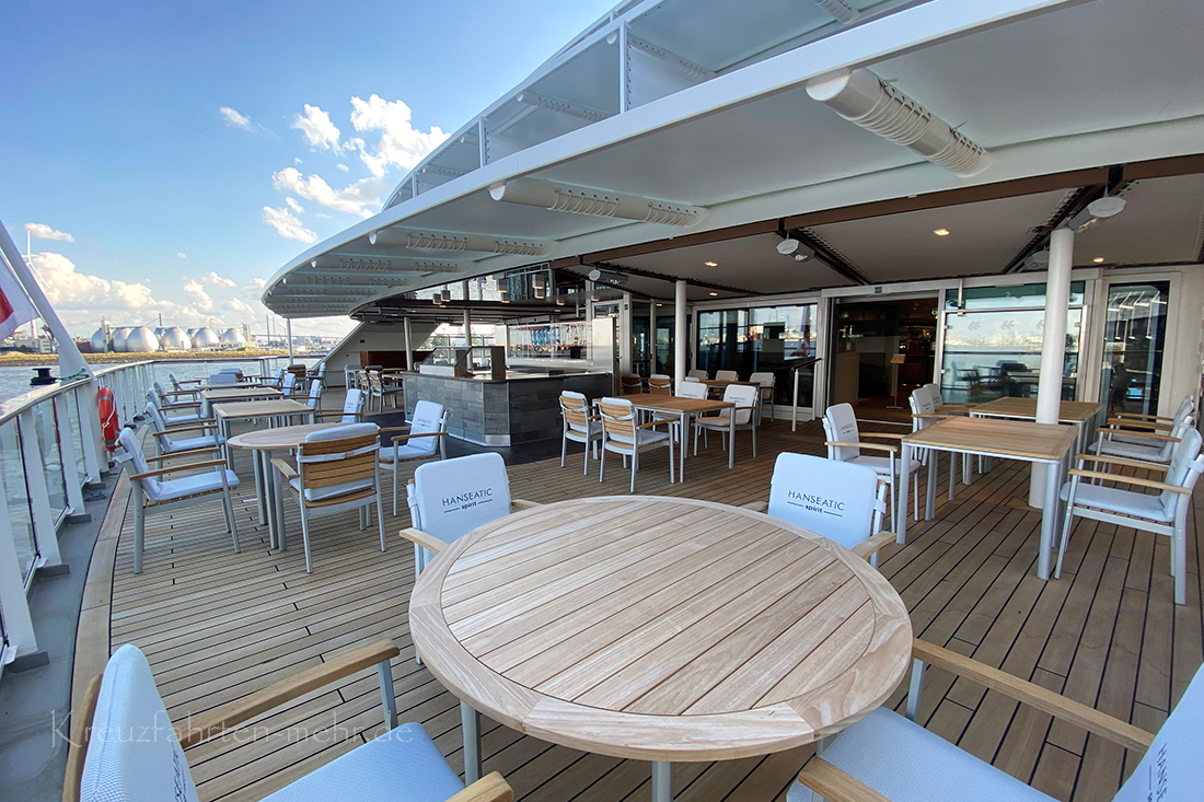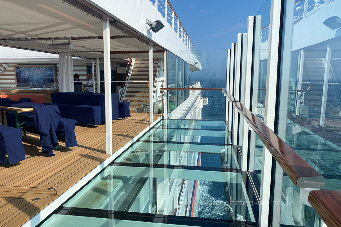 Absolut einmalig auf einem Expeditionskreuzfahrtschiff sind die ausfahrbaren, gläsernen Balkone, die sich seitlich des geräumigen, verglasten Pooldecks befinden. Die rundum aus Glas bestehende, etwa 10 Meter lange Plattform, die sich knapp zwei Meter über die Bordwand hinaus nach außen fahren lässt, war eine Idee des damaligen CEO von Hapag-Lloyd Cruises, Karl J. Pojer. Der ungehinderte Blick auf die 18 Meter tiefer liegende Wasseroberfläche lässt die Passagiere über dem Ozean schweben und bietet gleichzeitig perfekte Aussicht bei der Beobachtung von Walen, Delfinen oder anderen Meeresbewohnern.
