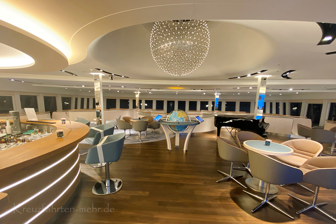 Die letzte Station auf meinem Schiffsrundgang ist die Observation Lounge mit integrierter und sehr gut sortierter Bibliothek. In der Observation Lounge können die Reisegäste die aktuelle Routenposition auf einem Bildschirm live verfolgen und sich am Nachmittag auf ein gemütliches Kaffeestündchen, mit einem der wunderbaren Bücher aus der Bibliothek, zurückziehen. Die Observation Lounge, in der namhafte Experten und weit gereiste Kosmopoliten, die ihre Berufung als leidenschaftliche Referenten und Expeditionsbegleiter zum Ausdruck bringen, kann als Vortragsraum genutzt werden. Die Reisegäste werden sicher von ihnen mit packenden Erklärungen gefesselt. Hochkarätige und aufwändig produzierte Shows, sowie ausgefallene Musikkünstler sind eher Seltenheit an Bord der Hanseatic spirit, denn der Fokus liegt klar auf den inhaltlich herausragenden und professionellen Lektoren Vorträgen bzw. Präsentationen. Kein Fremdwort hingegen sind Pianoklänge in der Observation Lounge.
