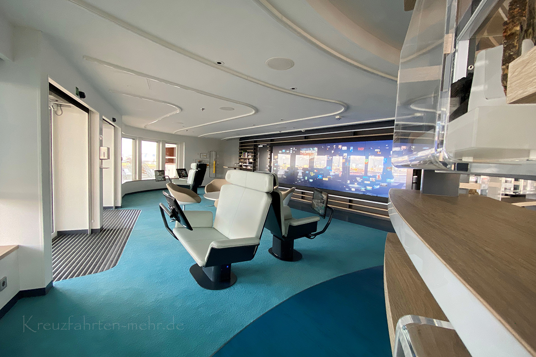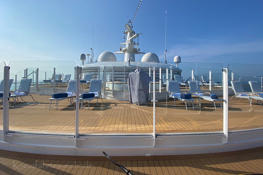 Nicht unerwähnt bleiben sollte das Sonnendeck auf Deck 9 vorne, welches oberhalb der Observation Lounge liegt und sich somit auf dem Dach dieser wiederfindet. Das Sonnendeck bietet sehr viel Platz für Sonnenliegen. Die gibt es an Bord in ausreichender Anzahl – in erster Linie für Beobachtungen der jeweiligen Fahrtgebiete. Obwohl es hier oben mitunter sehr windig werden kann, versperren keine Glasscheiben die wunderbare Aussicht. Wem es doch frisch wird, für den liegt auf jeder Liege, neben einem Handtuch auch eine Decke bereit.