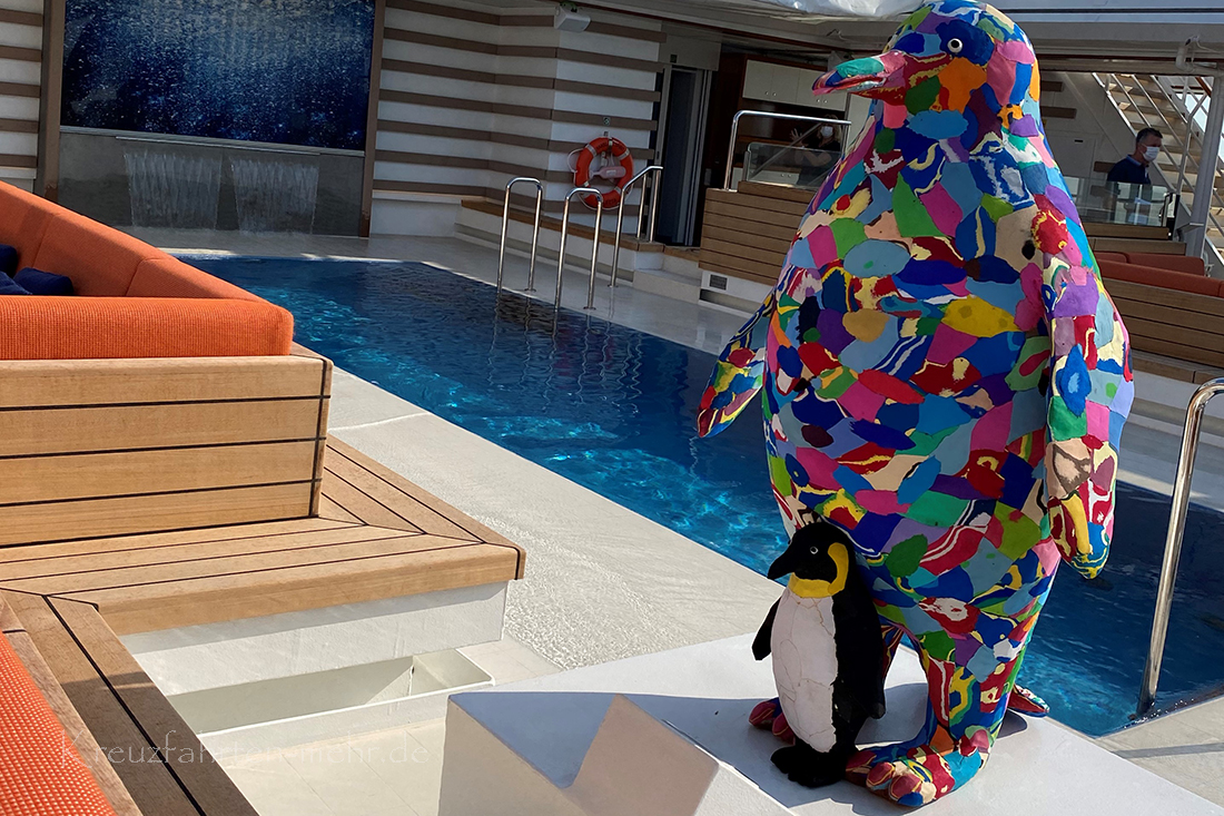 Direkt neben dem Swimmingpool fällt mir sofort ein kleiner, bunter Pinguin nebst Küken auf. Bei näherer Betrachtung liegt die Vermutung nahe, dass die Pinguine scheinbar aus Gummi bzw. Kunststoff bestehen. Diese Vermutung soll sich auf Nachfrage hin bestätigen. Von der Geschichte hinter diesen Pinguinen bin ich begeistert.