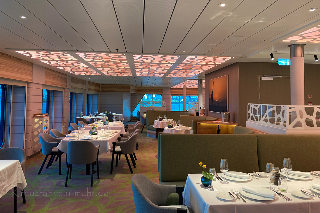 Damit sich die Kulinarik nach dem Expeditionserlebnis richtet und nicht umgekehrt, gibt es flexible Tischzeiten und freie Tischplatzwahl, was für alle Restaurants an Bord gilt.