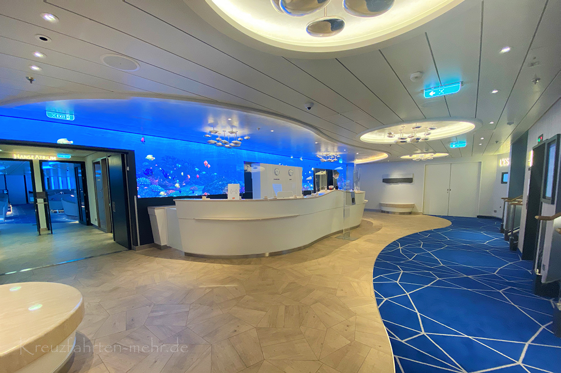 Der flauschige, blaue Teppich steht im Kontrast zu den hochwertigen Fliesen, die asymmetrisch, in geschwungener Form, vor dem Rezeptionsbereich verlegt sind. Es entsteht der Anschein, als würde der Tresen auf einer Eisscholle stehen. Hinter den freundlich lächelnden Damen, strahlt eine Unterwasserwelt auf einer LED-Wand. Die sich bewegenden Fische erwecken den Eindruck, als wäre man in einem spannenden Riff angekommen. Sie schwimmen ins Bild und verschwinden, ich könnte stundenlang zusehen…