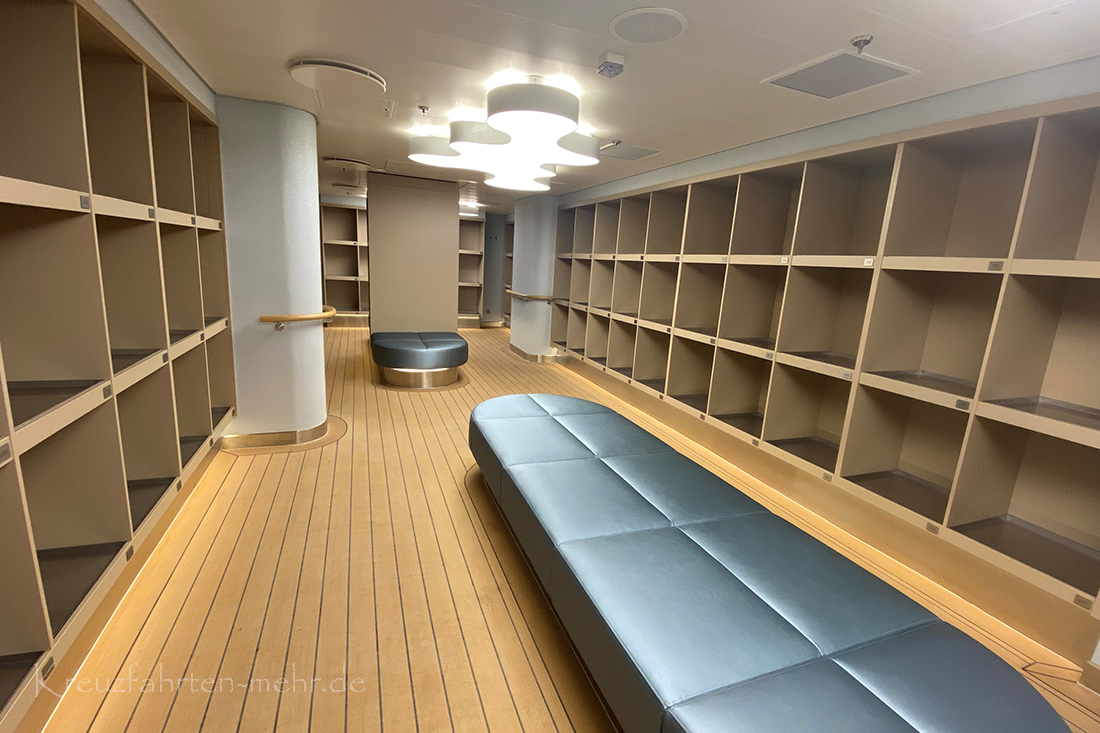 Beginnen möchte ich auf dem untersten der öffentlichen Decks. Ich werfe einen Blick in den Umkleideraum, welcher vor und nach allen Anlandungen bei Expeditionsausflügen genutzt wird. Das passende Equipment für die Anlandungen wie Gummistiefel, Regenschirme und wetterfeste Jacken sind für alle Reisegäste an Bord vorhanden. Nach Landgängen in ökologisch besonders empfindlichen Regionen (z.B. Antarktis) werden Schuhe und Kleidung mit Waschbürsten penibel gereinigt. So wird vermieden, dass Samen oder Sporen von einem Ort zum nächsten getragen werden. Auch die Treppen zu den Zodiacs sind von dort aus zu erreichen. Ab Deck 3 fährt auch der Fahrstuhl bis Deck 8.