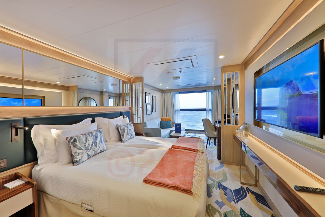 Auf den Decks 05 und 06 befinden sich ausschließlich Kabinen und Suiten, darunter Infinity-Kabinen. Die jeweils 25m² großen Infinity-Kabinen bieten ausreichend Platz, auch auf längeren Kreuzfahrten. Von den zwei horizontalen Glaselementen der Fensterfront kann das obere Segment per Knopfdruck abgesenkt werden. Dadurch entstehen eine Art Balkonbrüstung und ein großartiges Gefühl von Offenheit. Alle Kabinen sind mit einem Doppelbett ausgestattet. An Bord der World Voyager gibt es ausschließlich Aussenkabinen.
