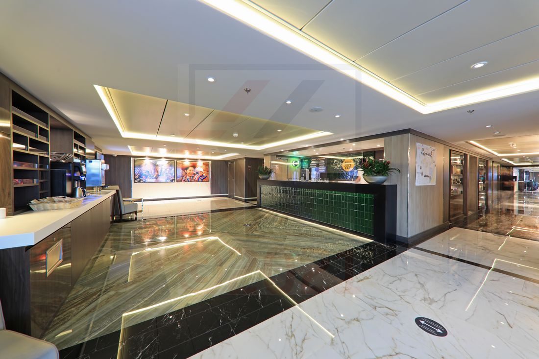 Wenn man auf die Details schaut und die Verarbeitungsqualität unter die Lupe nimmt, so stellt man fest, dass das Schiff nicht aus der Schmiede der Meyer Werft stammt. Das lässt sich beispielsweise an einer eher wellenförmig angebrachten Reling auf den Außendecks ebenso erkennen wie an den Schutzleisten einiger Treppenstufen, die bereits hier und da eine Delle aufweisen. Und Apropos Treppenstufen, die sind in den Treppenhäusern der World Voyager sehr hart. Hart? Ja! Während man in der Regel auf dickem Teppichboden nahezu lautlos die Stufen hinabläuft, so wurde der Schiffsstahl hier mit einem dünnen Holzfurnier beklebt. Das sieht schick aus, fällt aber in die Kategorie „günstige Materialien“. Die Armaturen in den Bädern der Kabinen/Suiten sind nicht von Markenqualität, was sich weniger in der Optik, wohl aber in der Haptik bemerkbar macht. Der weiße Kunststoffbelag in den Duschen ist unter bestimmten Voraussetzungen leicht rutschig, hier ist Vorsicht geboten. In den Kabinen wünscht man sich einen Kleiderhaken und mindestens in den Bädern der Suiten auch einen Schminkspiegel für die Damen. Die fehlenden Mülleimer in den öffentlichen Bereichen sind wohl durch die aktuellen Hygieneauflagen begründet. In den öffentlichen Bereichen sowie in den Gängen und Treppenhäusern ist es immer ratsam, einen Blick auf den Boden in Laufrichtung zu werfen, sofern man nicht in eine der wenigen Stolperfallen geraten möchte. Das Seeverhalten der World Voyager war auch bei 3m Wellen ordentlich und nicht auffällig. Gespannt darf man jedoch sein, wie anfällig die großen Panoramascheiben (einfaches Sicherheitsglas) in der Main Lounge auf Deck 4 gegen Seeschlag sein werden. Die als Notausgänge konzipierten Außentüren der Observation Lounge auf Deck 7 wurden bei Windstärke 8 vor den Kanarischen Inseln so weit eingedrückt, dass der Regen nicht komplett draußen blieb. Natürlich handelt es sich hierbei nicht um Schwachstellen, die ein Reiseerlebnis mit der World Voyager mindern. Wer jedoch schon Sturmfahrten auf kleineren Kreuzfahrtschiffen erlebt hat, wird meine Gedanken nachvollziehen können. Zusammenfassend lässt sich festhalten, dass keine gravierenden Mängel oder Kritik zu erkennen sind. Diese verstecken sich eher im Detail, bei näherer Betrachtung. Nicht unerwähnt lassen möchte ich die Tatsache, dass die Türen vom Sonnendeck (Deck 7) in die Treppenhäuser etwas versteckt liegen und nicht direkt als solche zu erkennen sind. Man verwechselt sie schnell als Tür in einen "Crew only-Bereich". Ähnlich irritierend ist die Tatsache, dass die beschriebenen Außentüren, die von der Observation Lounge zum Außendeck führen, nur zu einer Seite öffnen. Man kommt zwar vom Innenbereich auf das Außendeck, nicht aber wieder zurück. Das geht nur mit einem Umweg durch das vordere Treppenhaus. Wer mal schnell ein Foto vom Außendeck aus machen möchte, muss jedes Mal einen umständlichen "Umweg" zurück in die Lounge laufen. Andererseits wird dadurch die Frequentierung der Tür reduziert, wodurch das Wohlbefinden der Gäste (z.B. durch Wind) innerhalb der Lounge nicht gestört wird. Bemerkenswert ist die sehr hohe Anzahl an Desinfektionsspendern an Bord.