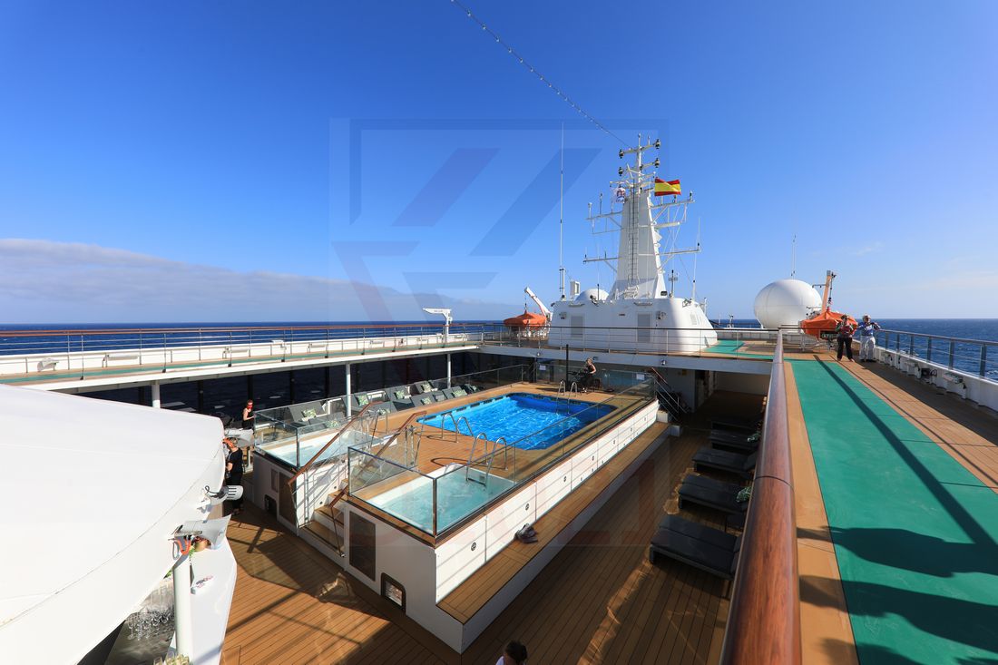 Der Swimmingpool ist für ein Kreuzfahrtschiff dieser Größe ausreichend bemessen, um darin zumindest kleine Bahnen ziehen zu können. Ein Großteil der Tische und Stühle, die sich um den Pool herum befinden, sind unter der oberen Galerie von Deck 08 aufgestellt. Damit sind sie überdacht und auch bei weniger schönem Wetter nutzbar. Es gibt sowohl Sitzgelegenheiten als auch Sonnenliegen in größerer Anzahl. Derzeit ist diese aufgrund der gültigen Hygieneprotokolle reduziert. Der leicht erhöht platzierte Swimmingpool wird von zwei Whirlpools flankiert. Der Pool verfügt über drei Treppen-Zugänge. Zwei davon sind dem Schiffsburg zugewandt und ein größerer, dritter befindet sich auf Höhe der Bar bzw. des Lido Cafés. Der Pool wird von einem Glasgeländer eingerahmt. Das Geländer kann komplett geschlossen werden und verhindert das Überschwappen des Poolwassers bei größerem Seegang auf das Sonnendeck. Da der Pool leicht erhöht aufgestellt ist, kann man nicht von der Backbord- zur Steuerbordseite hinüberschauen, sofern man sich auf Deck 7 befindet. Das Deck wirkt optisch sehr ansprechend, aber doch etwas vollgestellt.