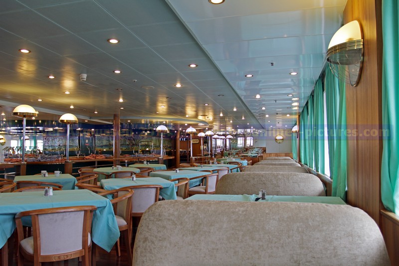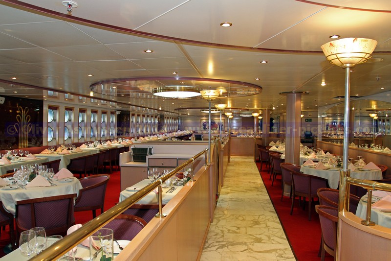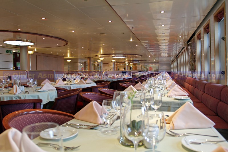 Der Zugang zum Restaurant Olissipo erfolgt über das mittlere Treppenhaus auf dem Atlantic Deck (Deck 3). Zunächst erkennt man auf der Backbordseite einen abgegrenzten, etwas kleineren Restaurantteil, der sich optisch nur durch eine andere Farbe der Servierten vom Hauptteil unterscheidet. Auf der Steuerbordseite ist, durch eine zusätzliche Tür getrennt, ein kostenpflichtiges Steakhouse-Spezialitätenrestaurant untergebracht. Zwischen diesen beiden Séparées ist ein individuell nutzbarer Bereich zu finden. Geht man nun weiter in den Hauptteil, so fällt sofort die freundliche Farbwahl wie auch der helle Steinfußboden ins Auge. Während im ersten Restaurantteil das Tageslicht durch einzelne Bullaugen in den Innenbereich fällt, so passiert dies im Hauptteil durch zwei Reihen von Bullaugen übereinander. Dadurch entsteht ein insgesamt sehr angenehmer und relativ heller Eindruck.