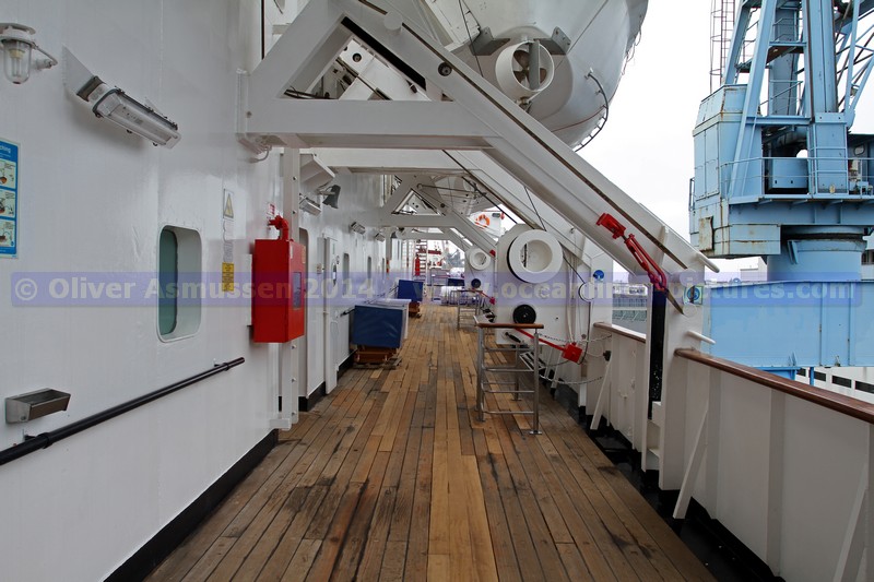 Für Liebhaber dieser wunderschönen Holzdecks ein wahrhaft schmerzhafter Anblick. Bis zu diesem Zeitpunkt wären uns die Kratzer im Teakholz noch gar keine Zeilen in unserem Bericht wert gewesen. Wie es sich gehört, haben wir dann aber die Promenade einmal umrundet. Auf der Steuerbordseite in Höhe der Rettungsboote blutete uns beinahe das Herz. Ziel war es dort offenbar, besonders marode Bereiche durch neue Holzbeläge zu ersetzen. Soweit kein Grund zur Kritik.