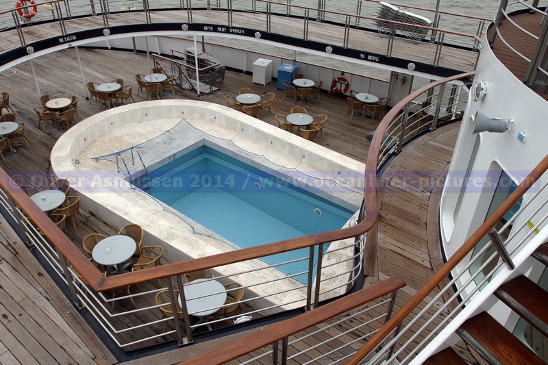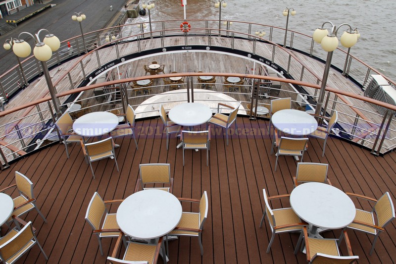 Auf den beiden oberen Freidecks ist der grüne Kunstrasenteppich einem deutlich schöneren in Holzoptik gewichen. Für uns unverständlich, warum nicht auch Reedereien im Luxussegment diesen altmodischen, grünen Kunstrasen durch neuere Varianten ersetzen. Phoenix Reisen war schon vor längerer Zeit einer der ersten Kreuzfahrtanbieter, der seine Kreuzfahrtschiffe vom grünen Campingdesign vergangener Tage befreite.