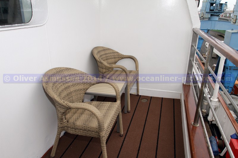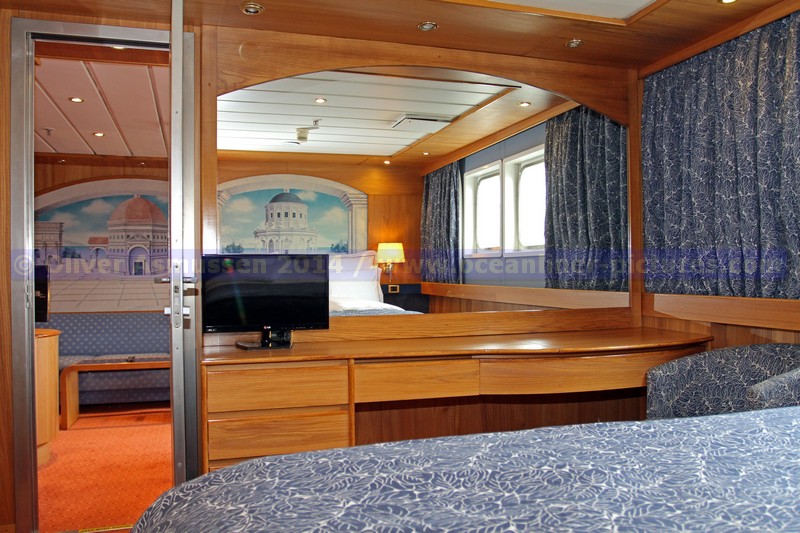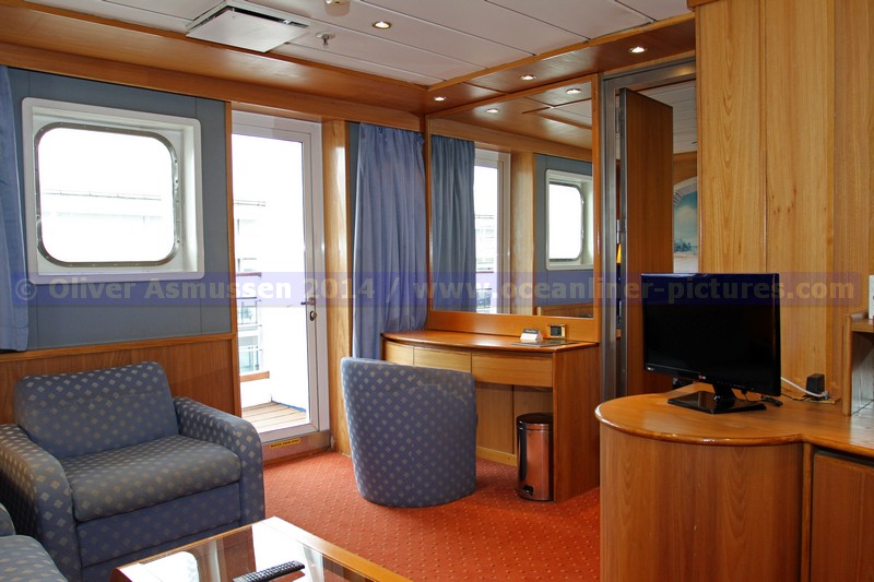 Bei den Kabinen der Kategorie 10 handelt es sich genauer gesagt um Balkonsuiten mit einer Größe von 22-32 m². Der Gesamtzustand der Suiten ist durchaus als gut zu bezeichnen, wenn auch die Polster der Sitzmöbel nicht erneuert wurden.