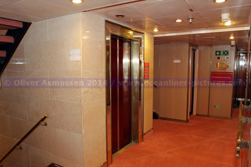 Das Restaurant wieder verlassen begibt man sich ein Deck höher, auf das Mediterranean Deck (Deck 4). In erster Linie ist auch dieses Deck ein Kabinendeck, welches im Bereich der Kategorie 9 durch die Rezeption und das Bordreisebüro unterteilt ist.