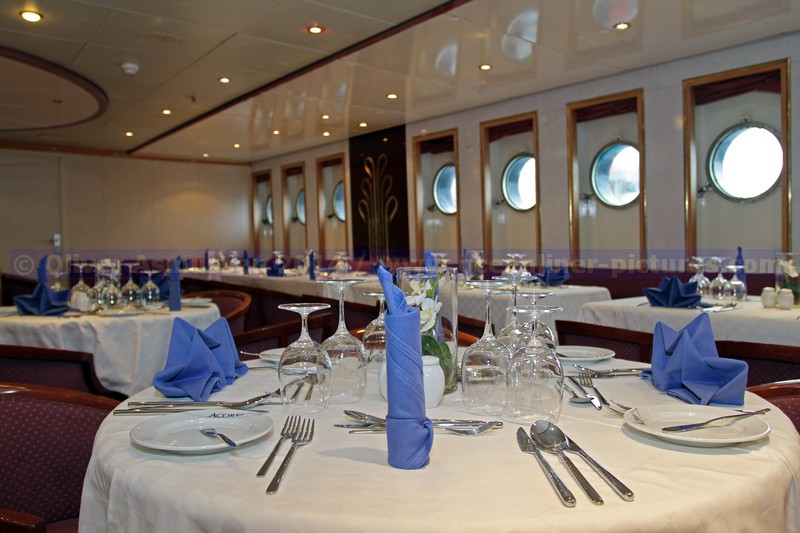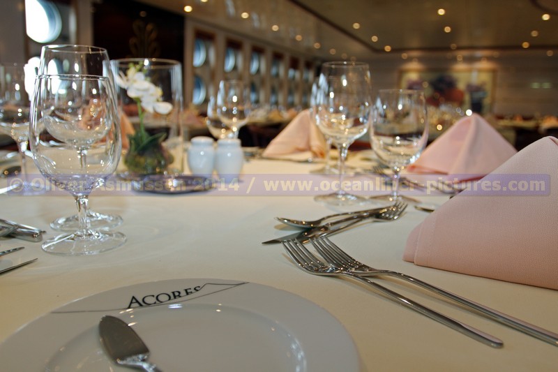 Im Restaurant Olissipo wird mittags und abends ein mehrgängiges Menü serviert. Auch an Themenabenden und zum Kapitäns-Dinner bietet das Restaurant den feierlichen Rahmen. Das Porzellan im Restaurant ist mit einem schönen Detailmerkmal versehen – der Name „Acores“ ist auf allen Tellern abgedruckt.