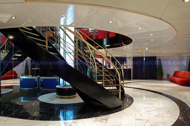 Foto: das elegante und großzügige Foyer mit geschwungenen Treppen zum Calypso Deck