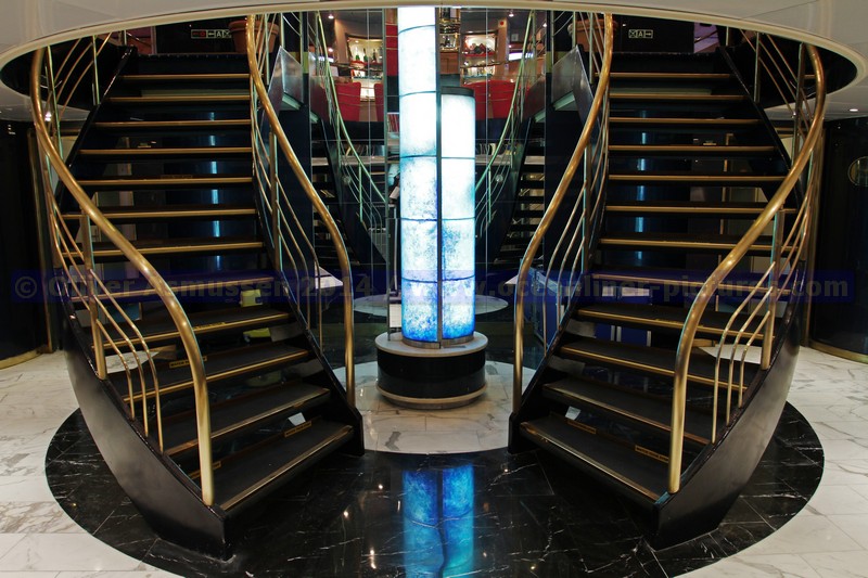 Nun kommen wir in den Bereich der Verbindung zum Mediterranean Deck (Deck 4), der sich durch zwei geschwungene Treppen und ein kleines Atrium auszeichnet. Durch die geschickt installierten Spiegel und Hochglanzflächen wirkt dieses Areal deutlich größer als es ist.