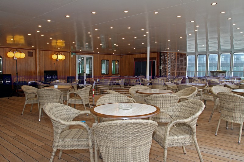 Die Aeolos Bar auf Deck 6 könnte stilvoller kaum sein und versprüht bei einem Blick auf den terrassenförmigen Heckbereich einen Hauch von Seefahrerromantik vergangener Tage. Die Reling der MS „Azores“ wurde bei einem der letzten Werftaufenthalt bereits komplett erneuert und kommt nicht im typischen weiß sondern im Edelstahllook daher - mit Ausnahme vom Promenadendeck.