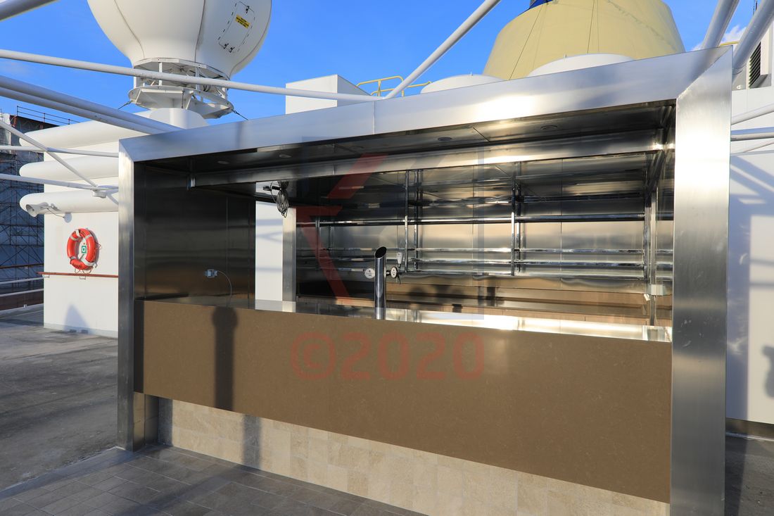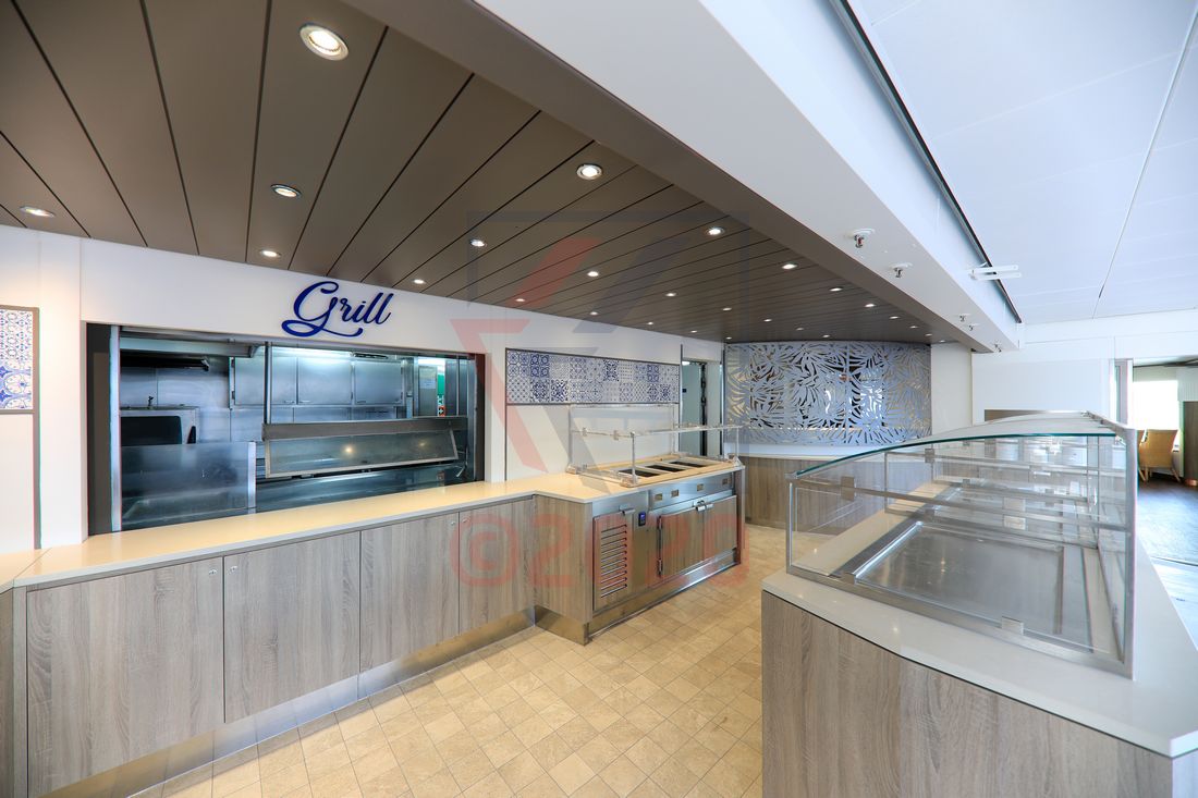 An der Grillstation überzeugt ein durchgängiger Thekenbereich mit klaren Linien und einer übersichtlichen Raumaufteilung. Glasscheiben sorgen für die nötige Trennung zwischen Speisen und Gästen. Im gesamten, sehr ansprechend gestalteten Bereich herrscht eine strukturierte Ordnung. Dort, wo sich vor der Renovierung die Öffnung einer Bar befand, ist nun eine zusätzliche Fläche für die Grillstation installiert. Den maritimen Charakter unterstreicht in einigen Bereichen ein Teakboden. Eine moderne Kaffee- und Tee-Theke rundet das Angebot der Grillstation ab.