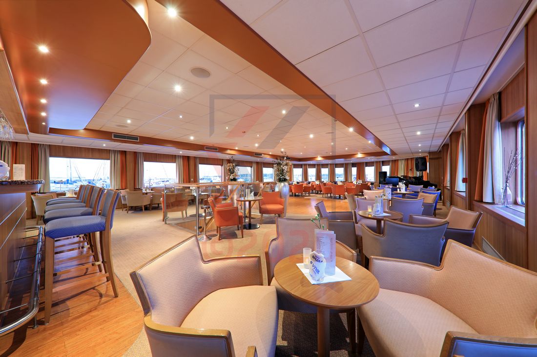 Die Panorama-Lounge ist das Herzstück der Junker Jörg und auch der gemütlichste Ort an Bord. Große Panoramascheiben ermöglichen freie Sicht auf die vorbeiziehende Landschaft. Helles Holzdekor harmoniert mit weichen Cremefarben und liebevollen Dekorationsdetails. Die Beleuchtung ist zu jeder Tageszeit angenehm. Eine Tanzfläche komplettiert die Einrichtung der Panoramalounge. Abends sorgt Live Musik für unterhaltsame Momente. Die gut sortierte Bar lässt kaum einen Wunsch offen. Neben ausgewählten Kaffeespezialitäten sind auch Tagescocktails und eine große Auswahl Spirituosen erhältlich. Auf Raumteiler wurde in der Lounge weitgehend verzichtet, was einen freien Blick durch die großen Panoramafenster auf die Flusslandschaft ermöglicht.