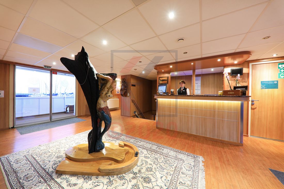 Beim Betreten der Junker Jörg fällt sofort das maritime Ambiente ins Auge. Das Foyer ist sehr großzügig bemessen, die Rezeption zentral gelegen. Auf der Steuerbordseite neben der Eingangstür befindet sich der Counter für die Buchung von Landausflügen. Darüber hinaus gibt es einen kleinen Shop und eine Sitzgelegenheit. Maritime Accessoires sowie eine große Wikinger-Figur in der Mitte des Foyers runden den angenehmen Gesamteindruck ab. An der Rezeption stehen rund um die Uhr freundliche Mitarbeiter mit Rat und Tat zur Seite. Die Begrüßung bei der Einschiffung ist herzlich, die Crew zeigt sich aufmerksam und zuvorkommend. Warme Hölzer sorgen in Kombination mit hellen Grundfarben für ein freundliches Erscheinungsbild. An der Rezeption befindet sich aufgrund der derzeit gültigen, strengen Hygienemaßnahmen eine Scheibe aus Plexiglas.