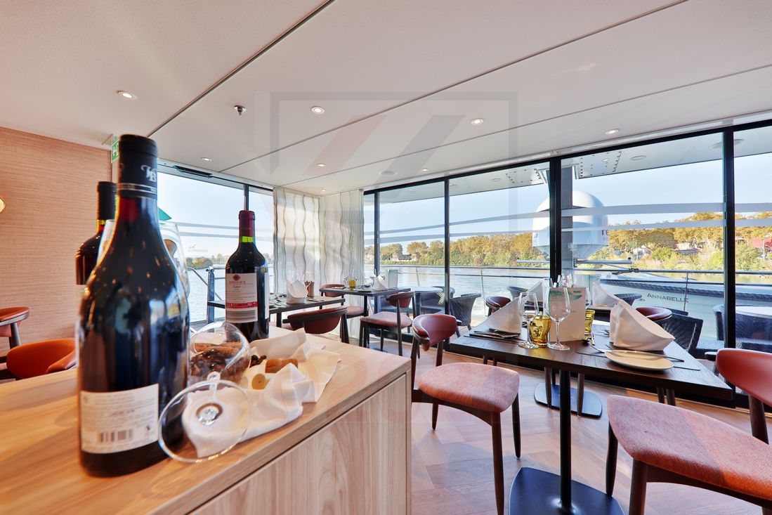 Die Panorama Bar ist stilvoll gestaltet, das Ambiente angenehm und einladend. Während der Tagespassagen auf den Flüssen bietet sich hier eine hervorragende Aussicht auf die vorbeiziehende Flusslandschaft. Abgerundet wird das durchdachte Konzept im Außenbereich der Panorama-Lounge, in Form einer möblierten Terrasse, direkt am Bug der MS Annabelle. Große Panoramascheiben sorgen dafür, dass man hier geschützt vor Fahrtwind auch über einen längeren Zeitraum verweilen kann. Heizstrahler an der Decke machen den Bereich auch an kühlen Tagen nutzbar.