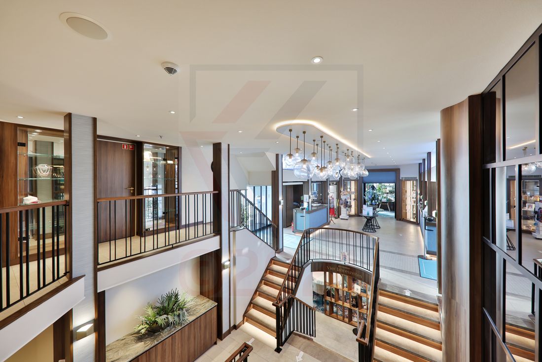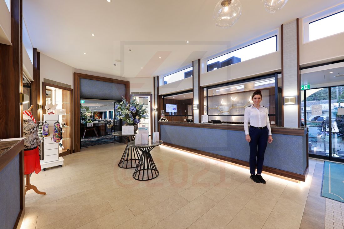 Schon beim Betreten fallen, neben der gastfreundlichen, aufmerksamen Schiffscrew, sofort das großzügige, elegante Foyer mit den hochwertigen Bodenfliesen, sowie zwei Granittische samt farbenfrohem Blumenschmuck ins Auge. Das Foyer der MS Annabelle präsentiert sich identisch zu jenem ihrer Schwesterschiffe MS Anna Katharina und MS Annika. An Bord der 2019 in Dienst gestellten MS Anna Katharina fand erstmals ein Wandel zu einem moderneren, weniger klassischem Design statt. Es dominieren keine Kristallkronleuchter mehr im Foyer sondern pfiffige Lampen in Seifenblasenform. An beiden Eingängen stehen Schirmständer mit Phoenix-Regenschirmen für die Gäste bereit, die kostenfrei ausgeliehen werden können – für den Fall, dass es bei Landausflügen mal einen unerwarteten Regenschauer auf dem Weg zum Reisebus gibt. Viel natürliches Tageslicht fällt in das Schiffsinnere durch breite Fensterelemente im Deckenbereich des Foyers. Wie auch auf der MS Anna Katharina zieren auffällige Teppiche („Läufer“) mit Phoenix-Logo beide Eingangsbereiche. Auf der MS Annika fehlen diese. Schade ist, dass man weiterhin auf eine Beschriftung der Bereiche im Foyer verzichtet. Es ist nicht erkennbar, ob man vor dem Ausflugsbüro oder der Rezeption steht. Auf älteren Einheiten (z. B. MS Anesha) gab es diese Hinweisschilder bzw. Beschriftungen noch.