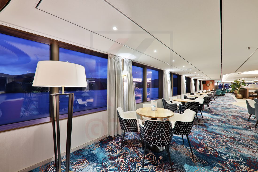 Wie auf den meisten anderen Flusskreuzfahrtschiffen auch, liegt im Vorschiff eine große Panorama-Lounge. Die ist auf MS Annabelle in harmonischen Cremefarben gestaltet, wirkt luxuriös und einladend zugleich. Aus den Wänden und Fensterbänken fahren bei Bedarf große Flachbildschirme. Besonders stilvoll geht es hier zur Kaffeezeit zu, wenn das üppige Tortenbuffet für reichlich Zulauf und für Begeisterung bei den Reisegästen sorgt. Im Vergleich zur MS Annika ist die Farbauswahl auf der MS Annabelle wieder deutlich besser gelungen. Während auf der MS Annika alles sehr „geradlinig“ wirkte, so zeigt man auf der MS Annabelle wieder mehr Mut zur Farbe – wozu der Teppich einen Großteil beiträgt. Alle Grundfarben orientieren sich am bekannten Phoenix-Türkis. Wie immer ist es eine Sache des persönlichen Geschmacks, aber der Gesamteindruck in der Lounge an Bord der MS Annabelle wirkt durch Detailveränderungen gemütlicher als auf der MS Annika.