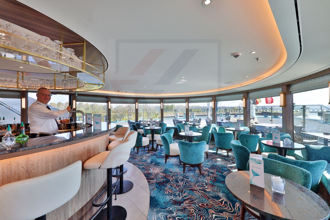 Im vorderen Bereich der Lounge gibt es die Panorama-Bar, von der aus sich ein hervorragender Blick in Fahrtrichtung bietet. Die Bar ist gut sortiert und lässt kaum einen Wunsch offen. Neben ausgewählten Kaffeespezialitäten sind auch Tagescocktails und eine große Auswahl Spirituosen erhältlich. Richtig pfiffig sind die Sitzgelegenheiten samt gemütlichen Polstern direkt vor den Panoramafenstern. Da wird eine Flusskreuzfahrt nicht nur in den Sommermonaten, sondern insbesondere zur kalten und dunklen Jahreszeit sehr gemütlich und zu einem besonderen Erlebnis. Von der Panorama Bar aus besteht die Möglichkeit über zwei seitlich angeordnete Treppen, das Sonnendeck zu erreichen.
