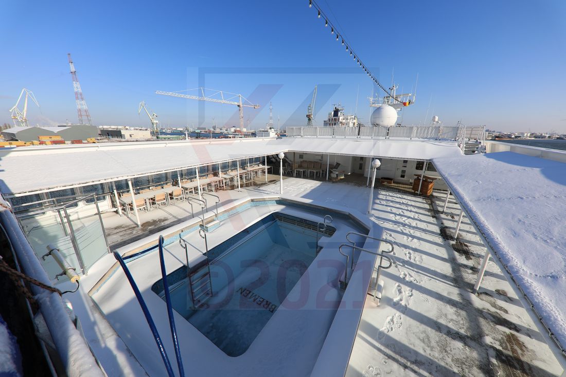 Das Thermometer zeigt -13 Grad, ein eisiger Ostwind fegt den zuvor gefallenen Schnee über die Pieranlagen der EDR Antwerp Shipyard, als ich an diesem Wintermorgen die SEAVENTURE in Belgien besuche. Immerhin, der Himmel ist blau und lässt den weißen Rumpf der ehemaligen MS Bremen von Hapag-Lloyd Cruises in gleißendem Licht erscheinen. Am schlanken Bug dieses waschechten Expeditionskreuzfahrtschiffes, sind noch die stählernen Lettern des bisherigen Namens, der 27 Jahre lang den Geist der Weserstadt in die entlegensten Regionen der Welt getragen hat, zu erkennen. Der neue Name SEAVENTURE ist bereits provisorisch, etwas oberhalb davon angebracht. Künftig wird die SEAVENTURE für die renommierte Schweizer Scylla AG in See stechen, die sich im Laufe der letzten Jahrzehnte einen Namen mit dem Angebot hochwertiger Flusskreuzfahrtschiffe machte.