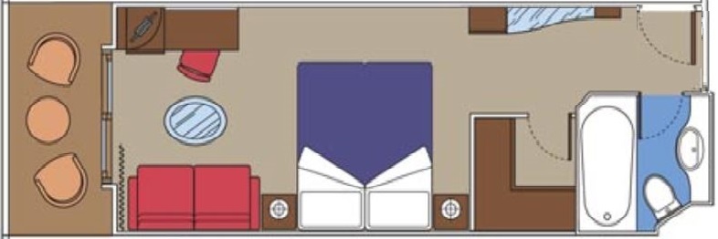 Wenn man die Kabine vom Gang aus betritt, sieht man direkt vor sich in Gangbreite das Badezimmer der Kabine. Der Vorraum der Kabine und das Badezimmer der Kabine liegen sozusagen in Verlängerung des Ganges, diesen Teil der Kabine hat man vom Gang sozusagen weggenommen. Wendet man sich im Vorraum nach rechts, kommt zunächst nach dem Badezimmer links der begehbare Schrank (inklusive Safe) und rechts nach einem Spiegel eine schmale Säule, welche geöffnet werden kann, in welcher wir z. B. Schuhe untergebracht haben. Nach dem begehbaren Schrank betritt man den Wohn-/Schlafraum der Kabine. Auf der linken Seite das Doppelbett (oder nach Wunsch zwei Einzelbetten) mit zwei Nachtkästchen, danach links eine Couch mit einem Tischchen vor der Balkontüre. Und auf der rechten Seite am Ende der Kabine neben der Balkontüre ein Schreibtisch (mit Hocker) mit Minibar und dem Fernseher.
