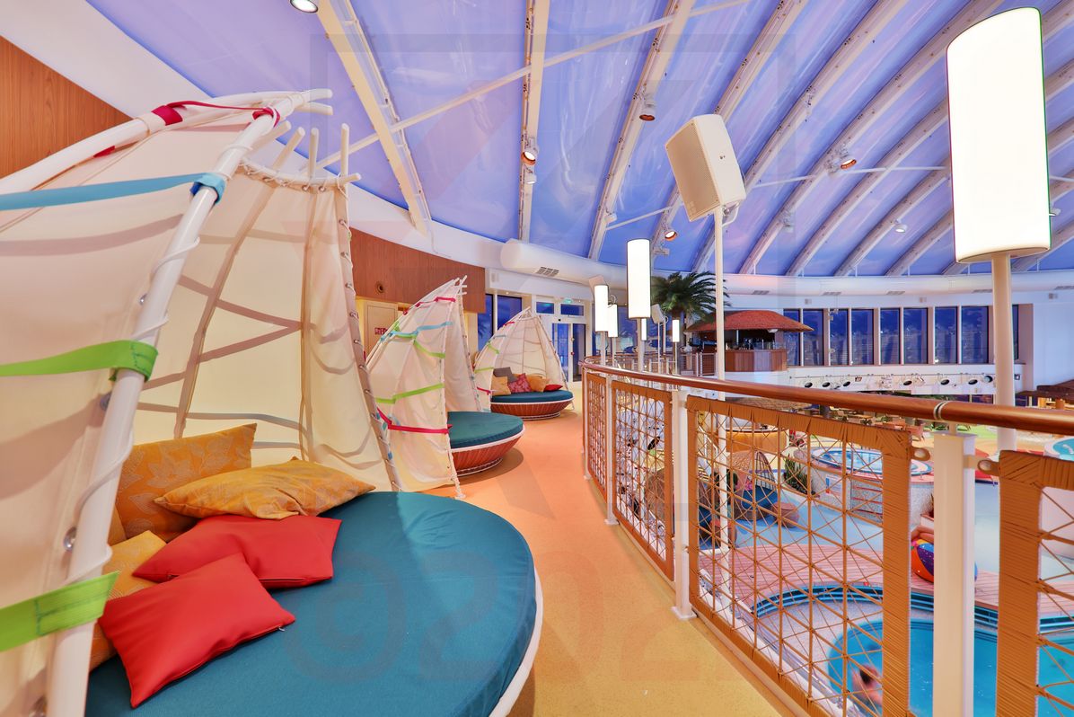 In unmittelbarer Nähe warten der Mini Club, der Kids Club und der Wave Club darauf, von den jüngsten Kreuzfahrtgästen entdeckt zu werden. Alle Kinder- und Jugendbereiche schließen an einen kleinen Außenbereich an. Die Erwachsenen können sich eine Auszeit nehmen und die Kinder haben die Möglichkeit, eigene Wege zu gehen, ohne dabei die Eltern komplett aus den Augen zu verlieren. Der gesamte Bereich ist insgesamt sehr schön gestaltet und wirkt großzügig. Im Mini Club werden die „Goldfische“ von 6-36 Monaten betreut, im Kids Club die 3-11-jährigen Entdecker und in der Teens Lounge (Wave Club) die großen Abenteurer von 12-17 Jahren. Im Bereich der Wasserbecken stehen Schwimmwesten für die Kinder zur Verfügung. Der Kids Club unterteilt sich noch einmal in die Altersgruppen von 3-6 Jahre (Seepferdchen), 7-9 Jahre (Delfine) und 10-11 Jahre (Sharks). Im Game Center neben dem Wave Club können sich die Teens an beliebten Spielautomaten die Zeit vertreiben.
