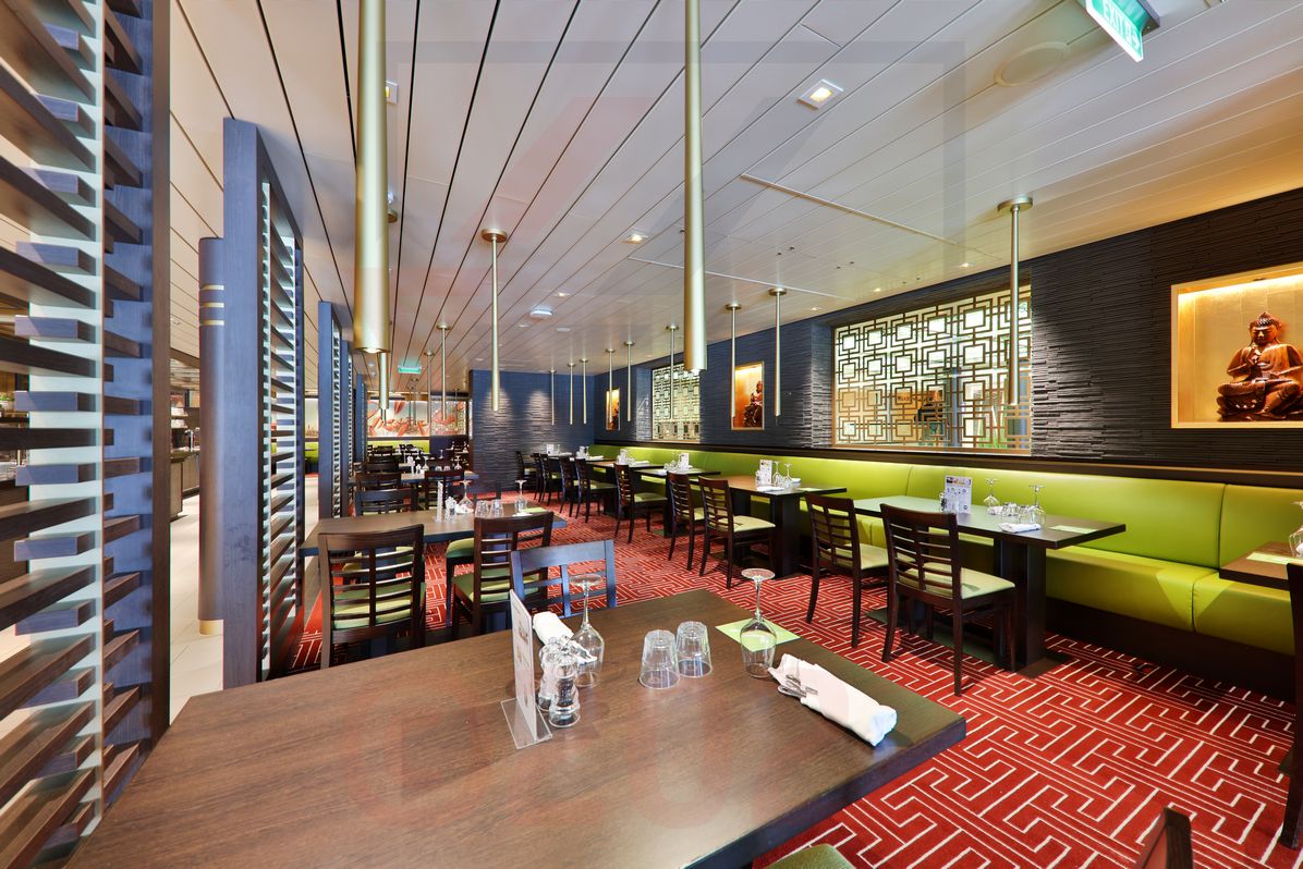 Das East Restaurant ist kulinarischer Treffpunkt für alle Fans der asiatischen Küche. Die Gerichte werden hier fertig zubereitet und an verschiedenen Buffetstationen präsentiert. Beim persönlichen Restauranttest ist das East durchgefallen, denn ich habe typische Speisen und Zutaten aus Fernost vermisst. Weder Frühlingsrollen, noch Sojasprossen, Huhn, Ente oder verschiedene Teigtaschen waren an den Buffetstationen zu bekommen. Ein Bisschen Reis und Rindfleisch haben mit einem asiatischen Restaurant für meinen Geschmack nichts zu tun. Vermutlich ist das aber so gewollt, damit die kostenpflichtigen a-la-carte Restaurants an Bord (Sushi House, Teppanyaki) entsprechend gebucht werden. Vielleicht sollte man eher darüber nachdenken, das Restaurant durch ein anderes, neues zu ersetzen, denn aus meiner Sicht ist das East an Bord ohnehin überflüssig.