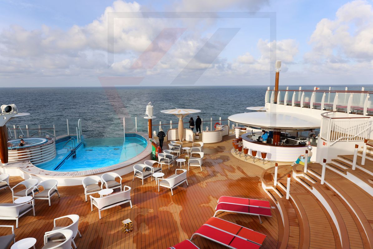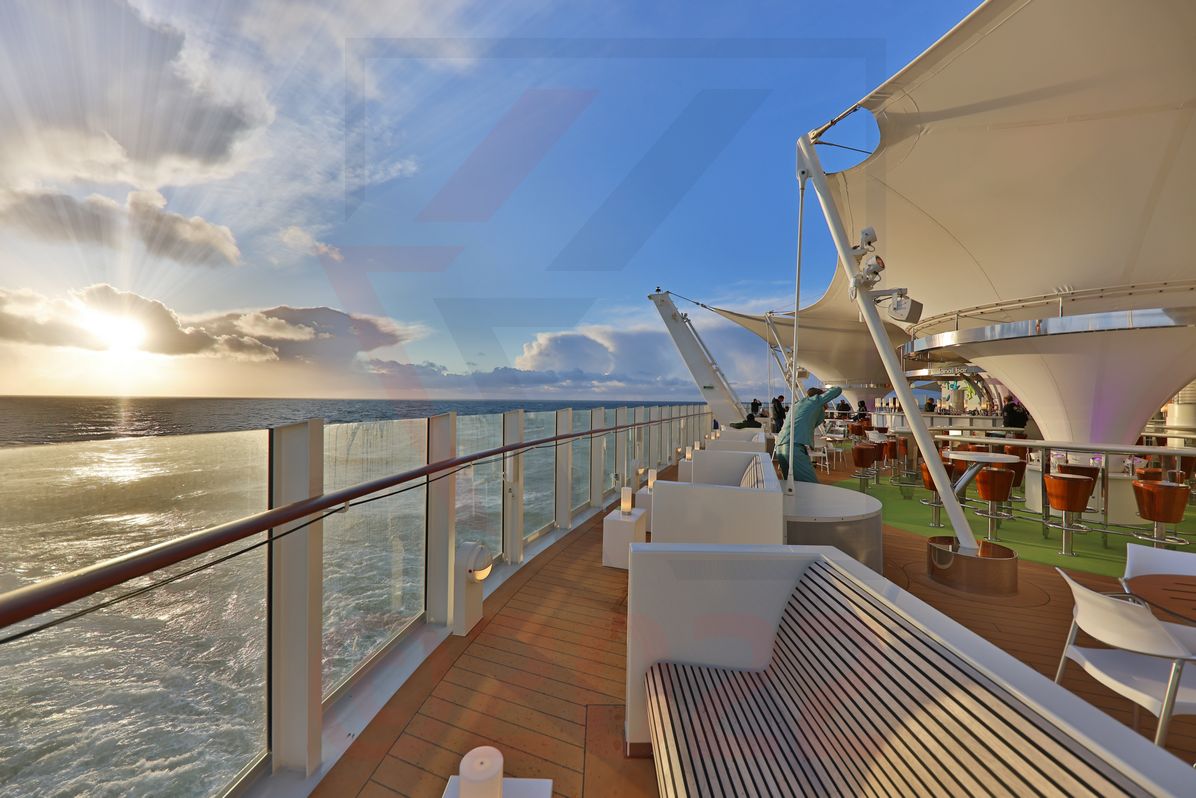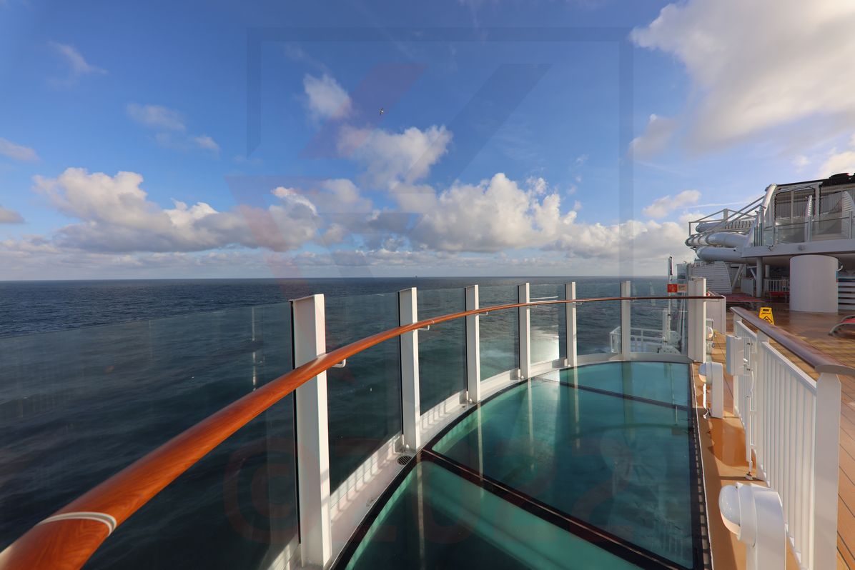 Ein weiterer, offizieller Aussichtspunkt ist am Heck entstanden. Er nennt sich Ocean View und stellt ebenfalls ein Deckbereich dar, auf dem Sonnenliegen aufgestellt sind. Schaut man seitlich durch Glasscheiben, so ist die Sicht in Richtung Heck völlig offen. Das Deck wird sich künftig sicherlich großer Beliebtheit erfreuen, insbesondere beim Ein- und Auslaufen in Häfen. Ein 270°-Blick ist garantiert.