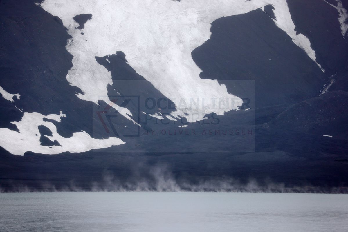 Kapitän Igor Gaber nimmt Kurs auf die Caldera von Deception Island. Hier hat das Expeditionsteam an Bord der HAMBURG einen Slot in einer Bucht gebucht, in der Hoffnung, dass sich die Wellenhöhen dort in Grenzen halten und wir mit den Zodiacs eine Anlandung durchführen können. Die Hoffnung zerschlägt sich schon bei der Anfahrt auf „Neptune´s Bellows“ (Neptus Blasebalg), der Einfahrt in die Caldera von Deception Island. Zwar gelingt die Durchfahrt durch dieses enge Nadelöhr aber die Wellen in der Caldera erreichen Höhen von bis zu 1,5m. In Ufernähe sind sie niedriger, doch die Entscheidung fällt recht zügig „Eine Anlandung kann nicht durchgeführt werden“. Ein Expeditions-Kreuzfahrtschiff, welches nach uns in die Caldera einfährt, hat offenbar mehr Glück, denn in der benachbarten Bucht können Anlandungen erfolgen. Deception Island war 2017 meine erste Anlandungsstelle in der Antarktis. Wir nehmen mit der HAMBURG nun Kurs auf die Dallmann Bay. Ein weiterer, spontaner Wechsel der Anlandestelle ist aufgrund der hohen Anzahl an Kreuzfahrtschiffen in der Antarktis nicht mehr so einfach möglich, wie noch vor einigen Jahren. Freie Slots sind begehrt und bleiben in der Regel nicht lange ungenutzt. Während der Panoramafahrt durch die Caldera lässt sich die beeindruckende Vulkanlandschaft von Deception Island sehr gut beobachten. Der letzte Ausbruch des immer noch aktiven Vulkans war im Jahr 1970. Die dicke Ascheschicht, die sich über die Gletscher legte, ist auch nach mehr als 50 Jahren noch sehr gut erkennbar.