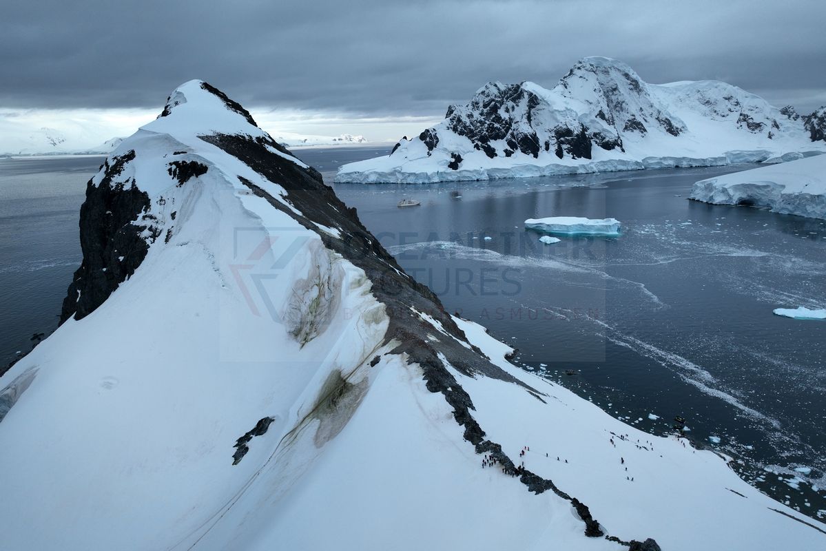Orne Harbour kommt in Sicht. Orne Harbour ist eine rund 1.000m breite Bucht an der Westküste von Grahamland. Entdeckt wurde die Bucht im Jahr 1898 im Rahmen einer belgischen Antarktis-Vermessung. Der Ort ist aus mehreren Gründen beliebt. Er befindet sich auf dem Festland, also dem Kontinent Antarktika. Wer hier an Land geht, betritt also den Kontinent und nicht eine der vielen vorgelagerten Inseln in der Antarktis. Was auf der vorherigen Etappe mit der HAMBURG nicht gelang, wird nun zu einem Highlight der Reise. Wie ein kleines Modellschiff sieht die HAMBURG zwischen den Gletschern und den Gipfeln der Berge aus. Die felsige Küste ermöglicht an einigen flachen Stellen Anlandungen mit Zodiacs. Von der Anlandungsstelle führt ein steiler Weg durch den Schnee hinauf auf einen Berg. Schon vom Weg aus bieten sich immer wieder atemberaubende Ausblicke. Oben angekommen wird die Anstrengung in jeder Hinsicht belohnt. Auf dem Felsen brütet stets eine Kolonie von Zügelpinguinen, die man wunderbar beobachten kann. Außerdem ist die Aussicht nicht in Worte zu fassen. Orne Harbour zählt zu einem der schönsten Stellen, die man in der Antarktis besuchen kann. Auf dem nachfolgenden Foto gut zu erkennen sind die Bucht, die HAMBURG in der Bucht, der Berg auf dem die Zügelpinguine brüten und die Gruppe an Gästen, die sich gerade auf dem Weg im Schnee befindet.