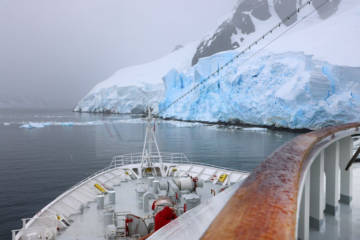 Nach dem Verlassen von Port Lockroy nimmt Kapitän Gaber mit der HAMBURG Kurs auf den Lemaire Kanal, der zu den ganz besonderen Passagen während einer Antarktis-Kreuzfahrt gehört. Beim Lemaire-Kanal handelt es sich um eine Meerenge zwischen der Antarktischen Halbinsel und der vorgelagerten, acht Kilometer langen Booth-Insel. Die Länge des Kanals beträgt circa sechs Kilometer, an der schmalsten Stelle ist er nur 720m breit. Die Berge an beiden Seiten des Kanals sind 1.000-1.500m hoch, was die Passage zu einer besonders Beeindruckenden macht. Die Durchfahrt hängt sehr stark von den jeweiligen Eisverhältnissen ab. Meist ist der Kanal von großen Eisbergen versperrt. Im Gegensatz zu meiner Reise 2017 klappt die Durchfahrt diesmal. Leider ist die Sicht insgesamt recht trüb, sodass die Berggipfel nicht sichtbar sind.