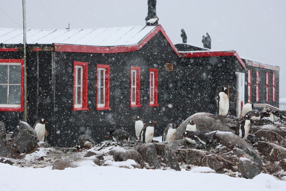 Am nächsten Morgen steht Port Lockroy auf dem Plan. Die Bedingungen scheinen diesmal perfekt. Naja, zumindest so halbwegs. Heute stürmt und regnet es nicht und es gibt auch keinen Nebel. Dafür ist die Sicht durch starken Schneefall getrübt. Die Temperaturen liegen bei -2 Grad, was für diese Jahreszeit noch in den normalen Bereich fällt. Port Lockroy liegt auf Goudier Island, einer kleinen Insel, die in einem wunderschönen Naturhafen liegt. Dieser ist umgeben von Gletschern und den schroffen Bergen der Wiencke Island. Port Lockroy ist eigentlich der Name der Bucht, gemeint ist aber die ehemalige Station, die heute neben einem schönen Museum auch das südlichste Postamt der Welt beherbergt. Die Station wurde 1944 als „Base A“ während der britischen Operation Tabarin gebaut.