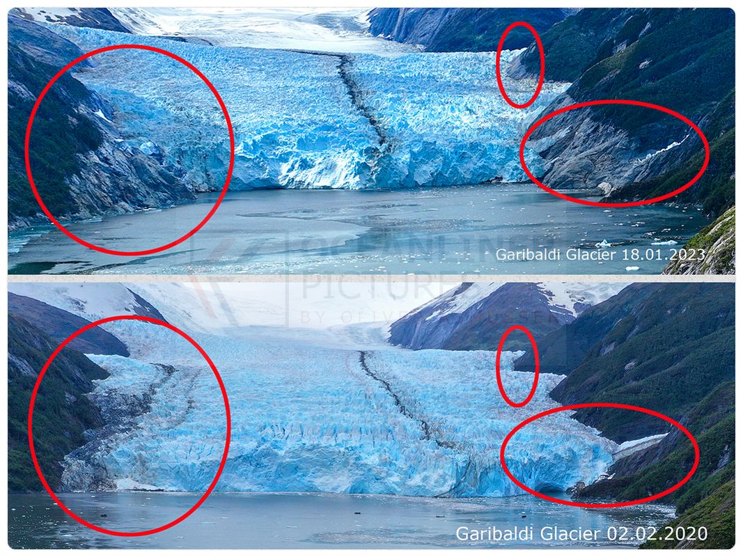 Vor einer Engstelle am Ende des Garibaldi Fjordes wird das Treibeis immer dichter. Das Eis stammt komplett vom Garibaldi Gletscher, der erst sichtbar wird, wenn ein Nadelöhr in Form einer engen Biegung durchfahren ist. Der Garibaldi Gletscher gilt als einer der schönsten Gletscher in Chile und zieht alle Reisenden sofort in seinen Bann. Auffällig ist die mediale Moräne (Mittelmoräne) des Garibaldi Gletschers. Eine Moräne ist eine Formation aus nicht konsolidiertem Gestein und Schutt, die von einem Gletscher mitgeführt wird. Beim Garibaldi Gletscher treffen sich zwei getrennte Eisflüsse, was als mediale Moräne bezeichnet wird. Der Garibaldi Gletscher ist allerdings nicht der einzige Gletscher im namensgebenden Fjord. Zahlreiche kleinere Gletscher zeigen sich an beiden Seiten des Fjords. Wie lange der Garibaldi-Gletscher noch im Routenplan von Kreuzfahrtschiffen bleibt, hängt stark von seiner Existenz ab. Denkbar wären in einigen Jahren vielleicht auch Anlandungen mit Zodiacs, um Wanderungen entlang der sich dann gebildeten Endmoräne zu unternehmen.