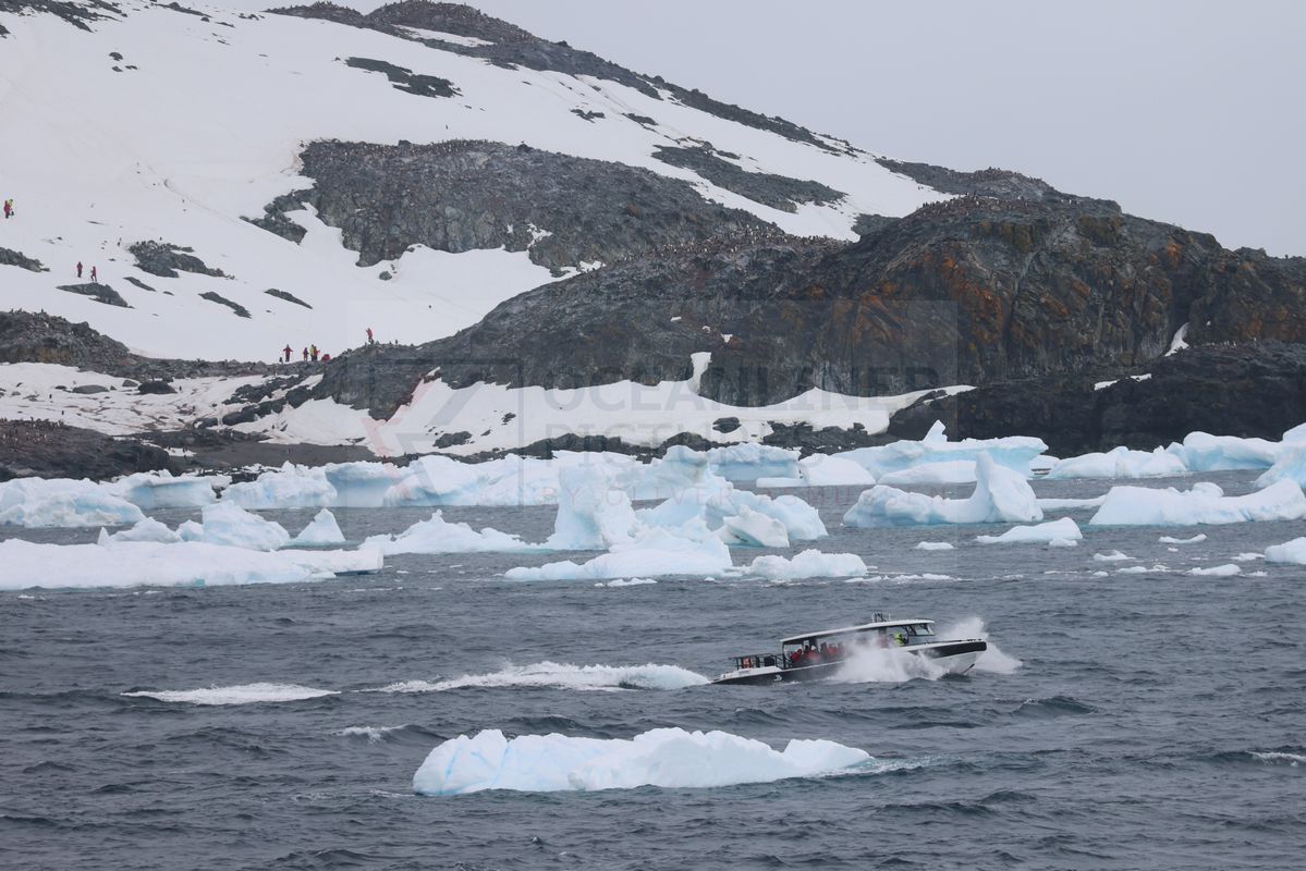 Bis zum Abend geht es mit sehr langsamer Fahrt entlang der Danco-Küste in Richtung Orne Harbor. Um die Mittagszeit kreuzen rund 20 Expeditions-Kreuzfahrtschiffe unseren Kurs. So einen massiven Schiffsverkehr habe ich hier 2017 nicht beobachten können. Zum Teil fahren die Kreuzfahrtschiffe, alle neuerer Bauart, im Konvoi hintereinander her, um zu ihren neuen Liegeplätzen für den Nachmittag zu gelangen. Es ist so voll, dass die geplanten Fahrtrouten sogar untereinander abgestimmt werden. Während die HAMBURG noch in langsamer Fahrt ihrem Kurs folgt, düsen zwei Special Operations Boats der VIKING Octantis an der HAMBURG vorbei, passieren den Fahrtweg und verschwinden in Richtung der Gletscher. Bei diesen Booten handelt es sich nicht um herkömmliche Zodiacs, sondern um Hartrumpfboote, ähnlich eines großen Rib-Boats, mit denen auch bei größeren Wellen gefahren werden kann. Diese 900 PS Boote werden von den beiden neuen VIKING Expeditionsschiffen, die mit 205m und 30.114 BRZ zu den größten in der Antarktis gehören, im Schiffsrumpf transportiert. Ähnlich wie bei einem Seenotkreuzer werden sie am Heck über eine Rampe zu Wasser gelassen und an Bord geholt. Die jeweils maximal 12 Passagiere steigen innerhalb des Kreuzfahrtschiffes in die Boote und verlassen sie auch erst wieder, nachdem die Boote an Bord geholt wurden. Was grundsätzlich nach einer tollen Möglichkeit klingt, entlegene Regionen zu erkunden, stört in der Antarktis doch sehr. Die 900 PS des PumpJet-Antriebs sind nicht zu überhören. Die Reederei selbst gibt sich als Botschafterin für den Klimaschutz, führt an Bord der Schiffe eigene Labore mit und arbeitet mit internationalen Universitäten zusammen. Ob es nun ein Widerspruch ist, wenn die Gäste - als Botschafter des Klimaschutzes - sich mit mehr als 30 Knoten durch den Lebensraum von Pinguinen und Seelöwen bewegen, möchte ich hier nicht beurteilen.