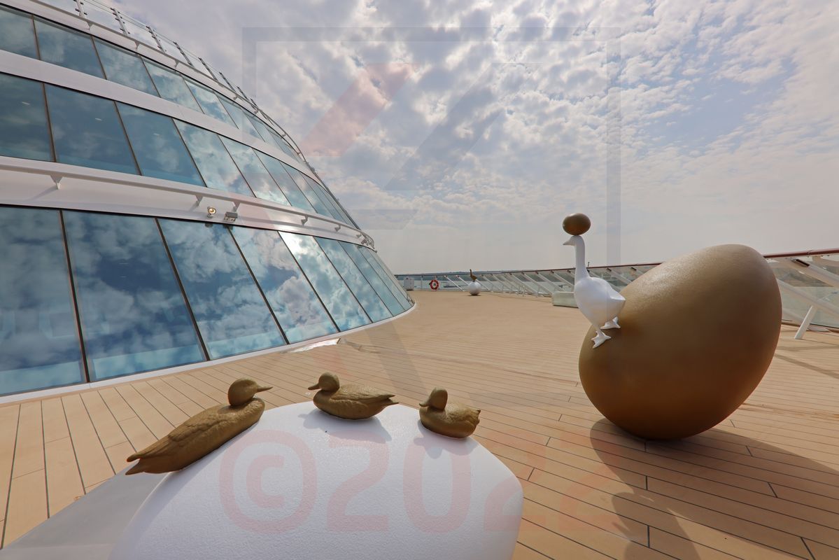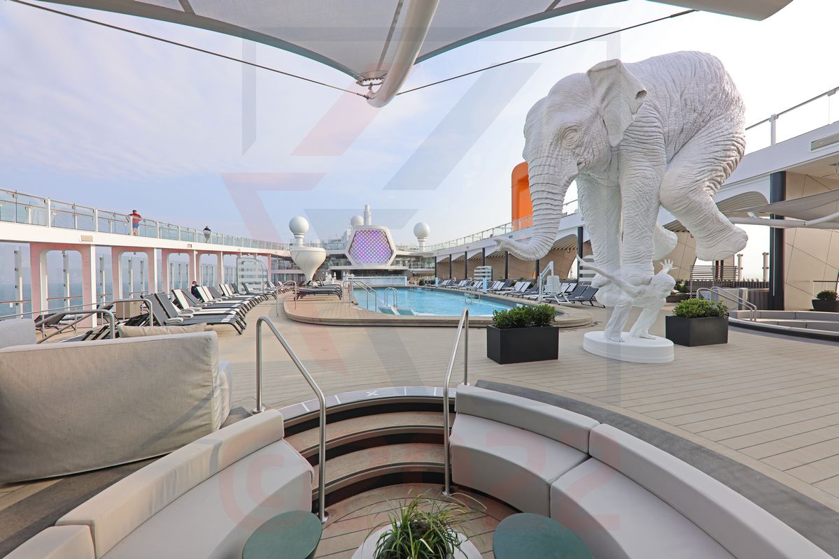 Sofern der Magic Carpet tagsüber auf Deck 14 positioniert ist, hat man von diesem einen freien Blick auf das Meer - nicht etwa nur an Steuerbord, sondern sogar auf der Backbordseite. Für ein Schiff dieser Größe ist das außergewöhnlich und unterstreicht das perfekte und durchdachte Design abermals. Auffällig ist die neue Kunstskulptur – ein von seinem Dompteur auf dem Rücken getragener Elefant. Damit bietet das Schiff gleich einen neuen „Instagram-Spot“.