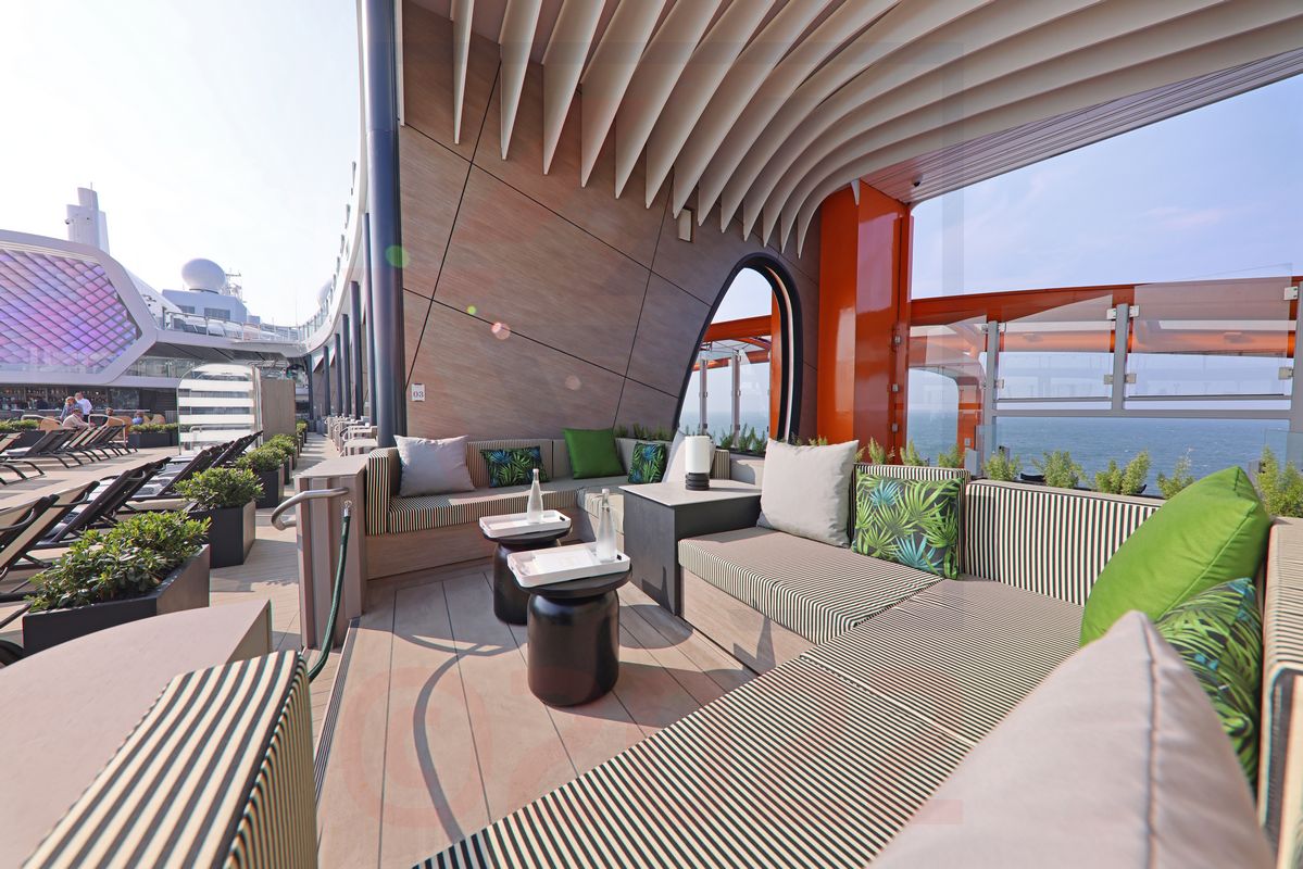 Ein kleiner Wehmutstropfen ist, dass es auch auf der Celebrity Beyond keine große Lounge in Fahrtrichtung gibt. Da sich diese Lounges in den letzten Jahren einer immer kleineren Beliebtheit erfreuten, gibt es sie auf fast keinem neuen Schiff mehr. Ersetzt wurden sie durch lukrative Suiten oder Suitenbereiche. Die einzige Möglichkeit, ein offenes Deck in Fahrtrichtung zu betreten, besteht vor dem Thermalbereich im Spa. Allerdings ist diese recht große Außenterrasse nicht offiziell als Außendeck nutzbar, sondern den Besuchern des Spa vorbehalten.