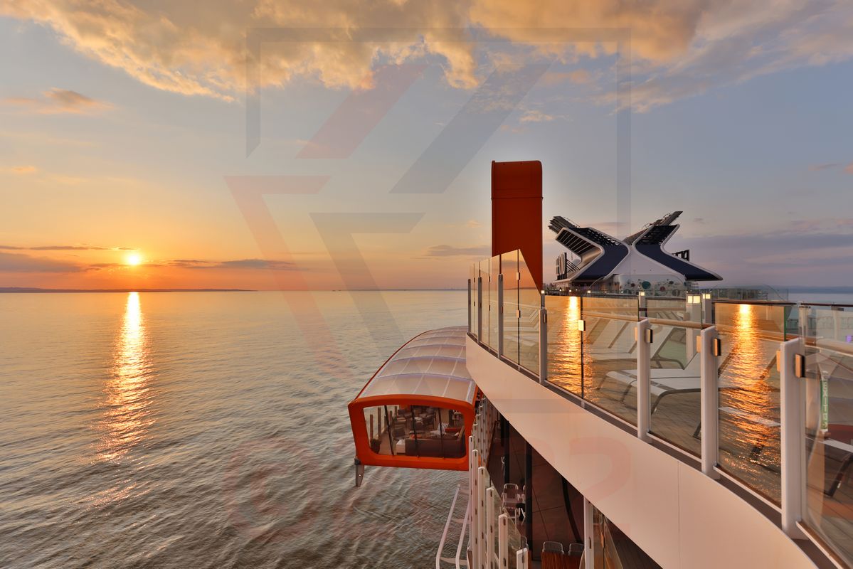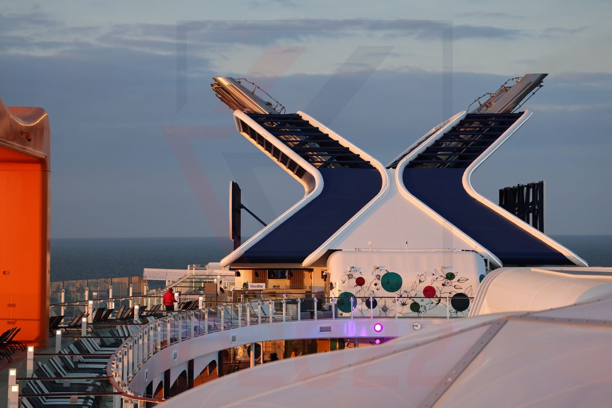 Nicht zu übersehen ist die im Vergleich zu anderen, neuen Kreuzfahrtschiffen dieser Größenordnung „verspiegelte“ Außenfläche im Bereich der Kabinen. Begründet ist das durch die hohe Anzahl an Kabinen, die über sogenannte Infinity-Fenster verfügen. Infinity Fenster erstrecken sich in ihren Ausmaßen über die gesamte Kabinen-Außenfläche. Sie lassen sich zur Hälfte absenken und erfreuen sich großer Beliebtheit bei den Gästen. Außerdem sorgt die glattere Außenfläche für weniger Windwiederstand im Vergleich zu anderen Schiffstypen. Rein nach Zahlen sind die Infinity-Balkone rund 1m² kleiner als jene vergleichbaren „Standard-Balkone“. Aus unserer Sicht ist ein Vergleich jedoch kaum möglich, da die in die Kabine integrierte Fläche der Infinity-Balkone als zusätzliche Wohnfläche genutzt werden kann, was bei Standardbalkonen nicht möglich ist. Man hat quasi die Wahl zwischen der Konfiguration als geschlossener Wintergarten oder als offener Balkon.