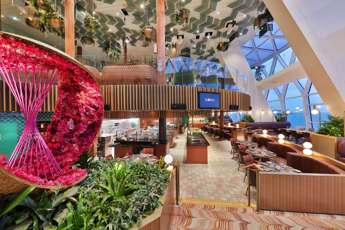 Die neue Show „Wonder at Eden“ wird auf einer kleinen Bühne dargeboten, die sich an anderen Abenden auch in eine „Silent Disco“ verwandeln lässt. Tagsüber ist die Eden-Lounge eine Rückzugs-Oase. Das Eden Restaurant bietet eine Auswahl sehr hochwertiger Speisen, während es auf der Celebrity Edge nur ein festes Menü gab. Die Eden Lounge ist tagsüber ein Ort der Entspannung, an dem man außergewöhnliche Cocktails genießen, ein Buch lesen oder einfach nur auf das Meer schauen kann.