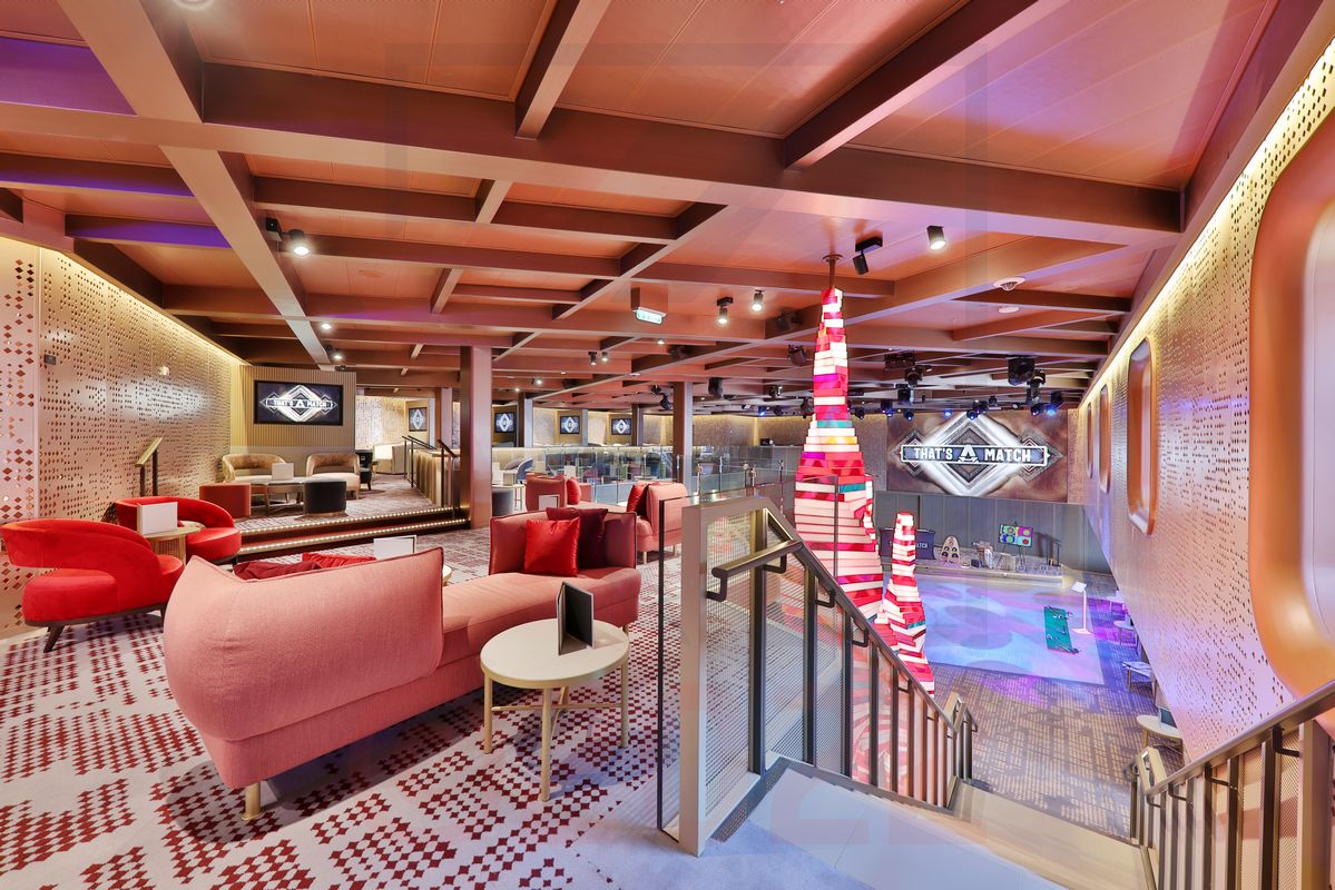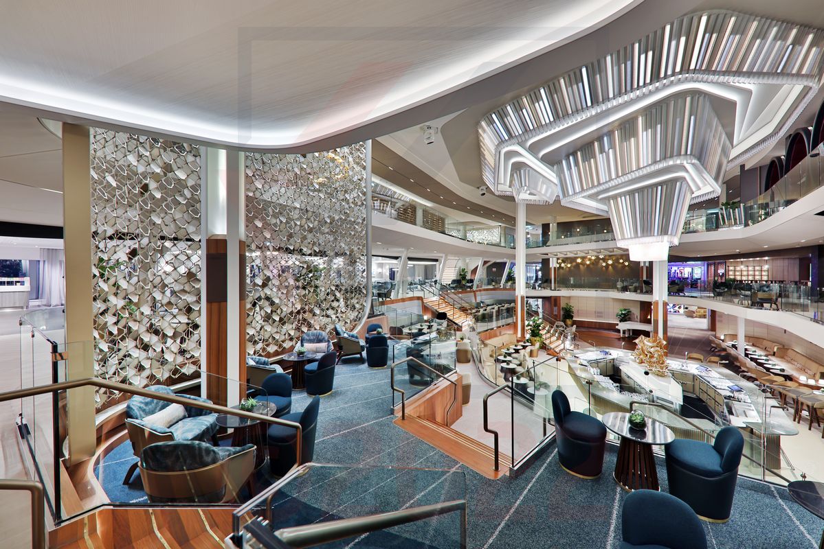 Auch auf der Celebrity Beyond ist die Grand Plaza das Herzstück des Schiffes und einer der zentralen Treffpunkte. Der riesige, offene Bereich wurde jedoch komplett neugestaltet. Die Martini Bar befindet sich nun mittig und ist von allen Seiten zugänglich. Wie schon auf den Schwesterschiffen lässt die Grand Plaza scheinbar drei Decks miteinander verschmelzen. Eine große Treppe, die das harmonische Design unterbrechen würde, fehlt. Diese sind eher unauffällig seitlich der Grand Plaza angeordnet und an das Design angepasst. Der Passagierfluss wird, wie auch in den anderen Bereichen des Schiffes, sehr geschickt gesteuert. So lenkt man die Gäste nicht über zwei zentrale Haupttreppenhäuser, sondern über viele kleine Nebenwege, was nicht nur Laufwege verkürzt, sondern auch größere Passagierflüsse auflockert. Die jetzt 950qm große Grand Plaza ist auch auf der Celebrity Beyond wieder ein Gesamtkunstwerk und bietet 163 Sitzplätze.