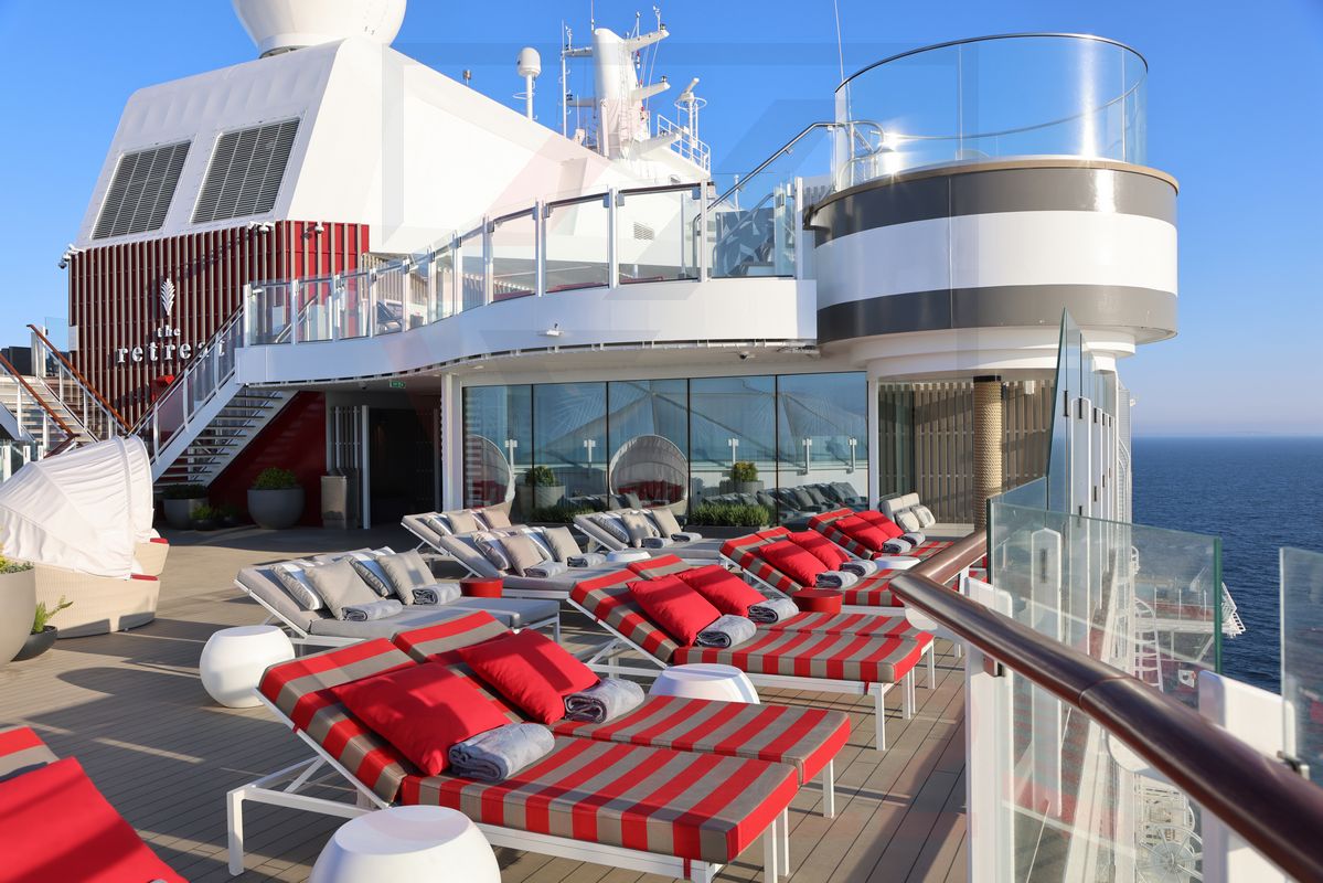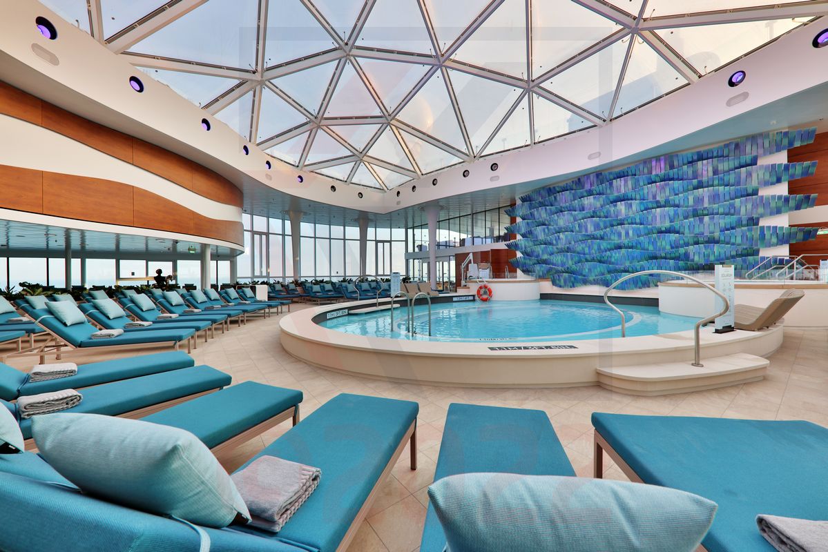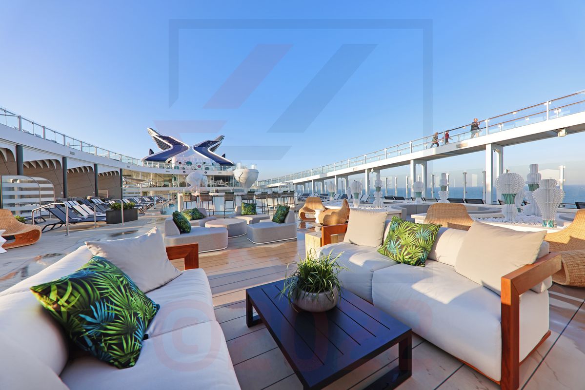 Star-Architekt Tom Wright zeigt nicht zuletzt auf dem „Resort-Deck“ was auf einem Schiff alles möglich ist und das große Kreuzfahrtschiffe nicht immer gleich aussehen müssen. Mit einer Länge von 22,8m gehört der Pool zu den größeren auf See. Doch die Blicke richten sich beim Betreten des Resort-Decks weniger auf diesen als auf die komplett verglaste Backbordseite der Celebrity Beyond. Das Resort-Deck öffnet sich quasi zum Meer hin. Auf der Rückseite, also Steuerbord, grenzen acht (2 mehr als bisher) Cabanas den Bereich ein. Hinter zwei stilisierten Blumenkelchen, genauer gesagt obendrauf, verbirgt sich jeweils ein Whirlpool. Es gibt keine Bühne unmittelbar am Pool. Diese würde nur das harmonische Gesamtbild stören und Platz „verschwenden“. Eine Live-Band fehlt dennoch nicht. Oberhalb der Poolbar spielt die Band in einem kleinen Loungebereich und ist dort zugleich vor möglichen Regenschauern geschützt. Eine Rampe, die auch als Jogginbahn genutzt wird, überwindet den Höhenunterschied von knapp 7m auf das darüber liegende Deck 16. Direkt vor der Pool Bar wurden neue, sehr gemütliche Sitzgelegenheiten geschaffen.