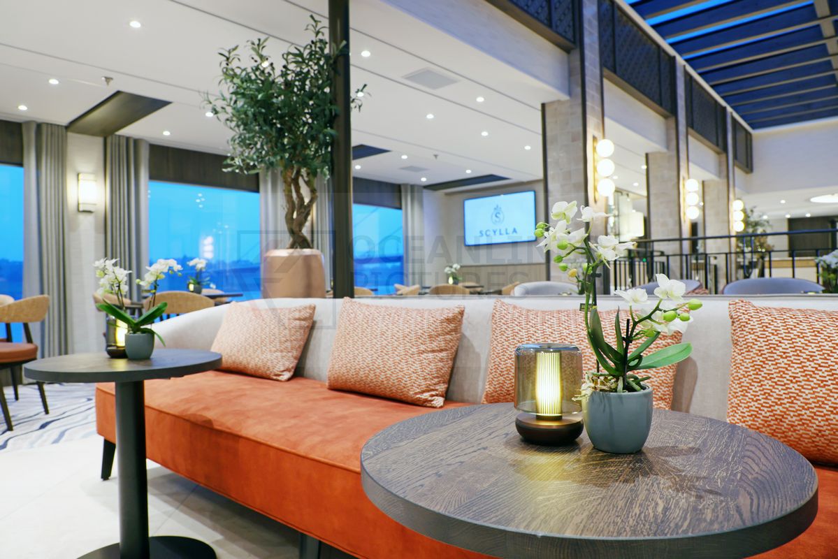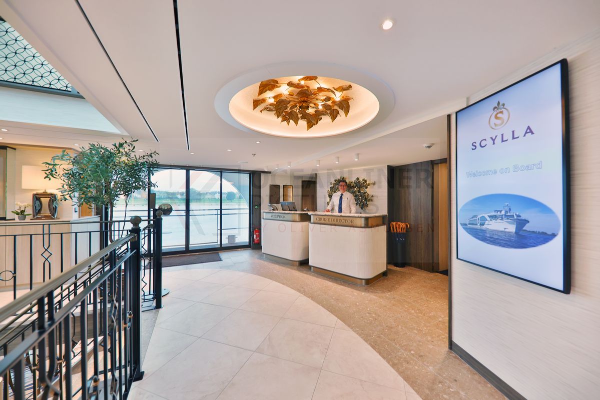 Stylische Designelemente und eine Deckenlampe in Blätterdesign runden den positiven Gesamteindruck im Eingangsbereich ab. Obwohl das Foyer komplett anders aufgebaut ist als an Bord der Rhein-Kreuzfahrtschiffe, so ist die typische Scylla-Handschrift unverkennbar. Die indirekte Beleuchtung unterstreicht die zeitlose Gemütlichkeit.