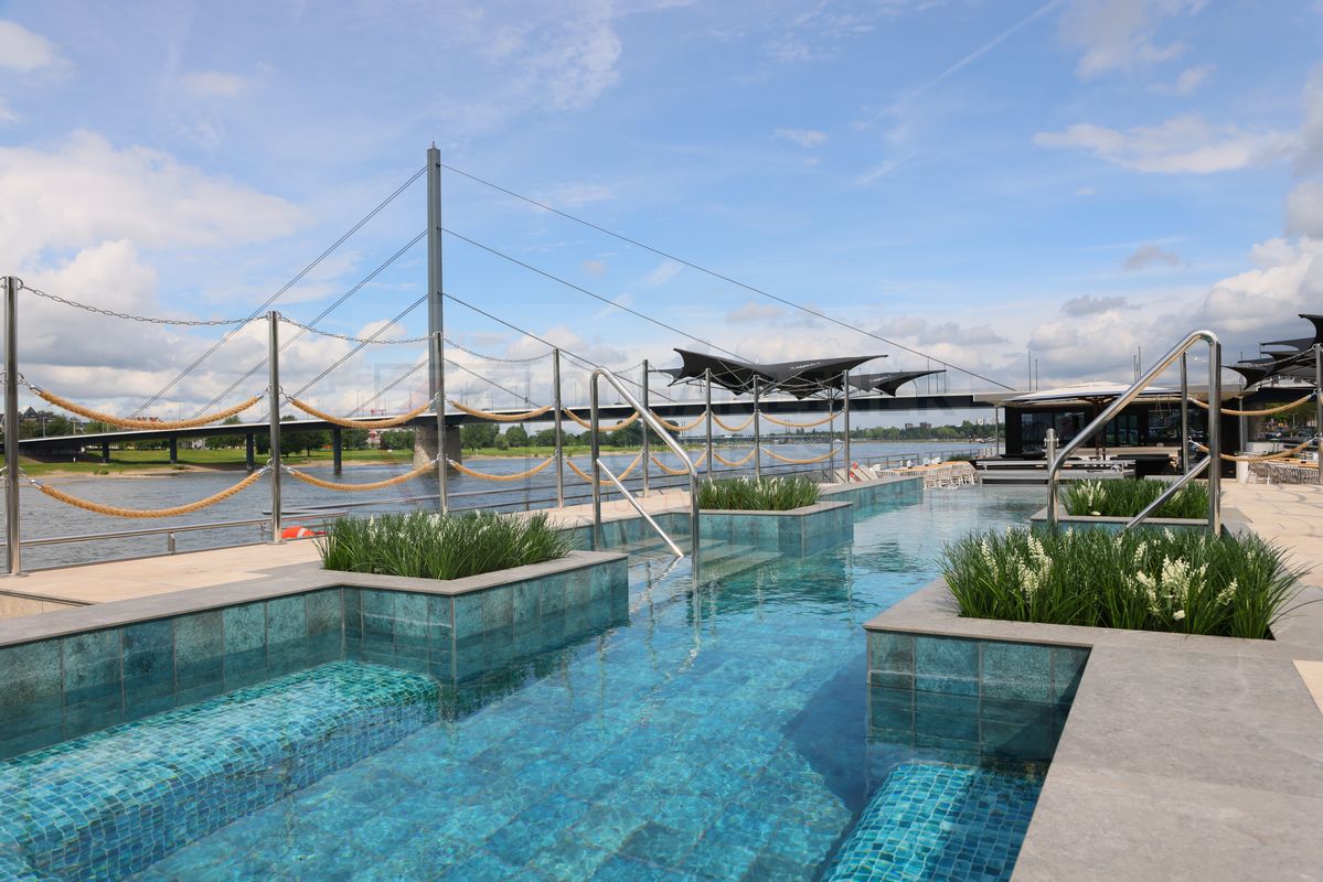 Das zweifelsfrei auffälligste Ausstattungsmerkmal auf dem Sonnendeck ist der überdurchschnittlich große, rund 6m lange Swimmingpool. Dieser bietet zwei Treppenzugänge, die über eine lange Empore zu erreichen sind. Der Pool endet zum Loungebereich in einem offenen Überlauf mit Wasserkaskade. Die Poolgröße ist an sich bereits beeindruckend, die sehr einladende Gestaltung mit ihren vielen Details machen ihn zu einer herrlichen Badeoase. Die Wassertemperatur des Pools liegt bei 30 Grad.
