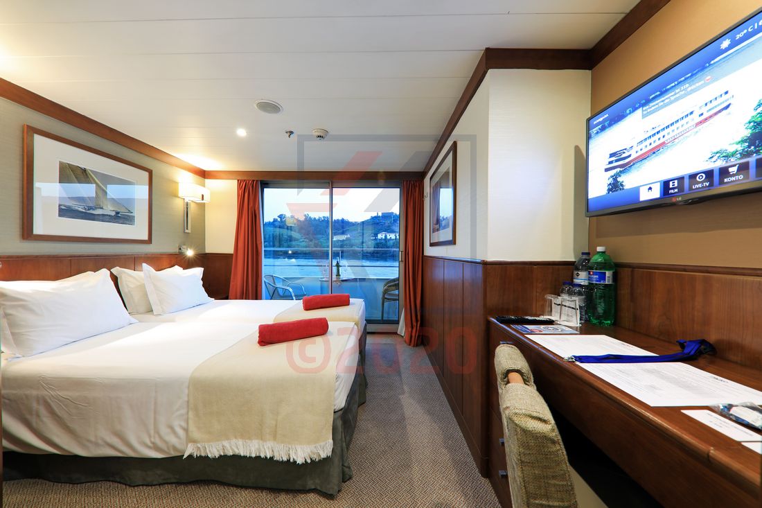 Alle Kabinen liegen außen, sind recht komfortabel und gemütlich ausgestattet und sind rund 15m² groß. Die Kabinen auf dem Oberdeck werden durch einen begehbaren, möblierten Balkon ergänzt. Die 27 Kabinen auf dem Hauptdeck verfügen über große Panoramafenster, die nicht zu öffnen sind. Zur Ausstattung gehören Dusche/WC, Fön, individuell regulierbare Klimaanlage, SAT-TV inkl. Flachbildschirm (in der Regel sind auch Deutsche Programme zu empfangen) und Safe. Die Betten lassen sich wahlweise als Doppel- oder Einzelbetten stellen.