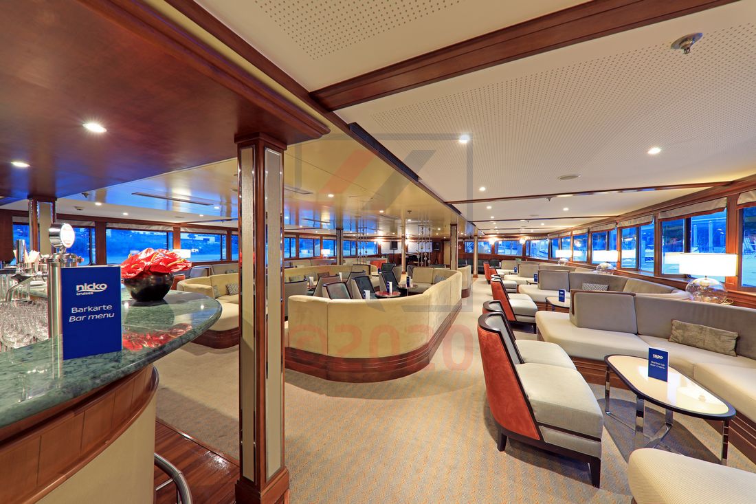 Neben der beschriebenen Rezeption befindet sich der Panorama-Salon samt Bar im vorderen Bereich des Hauptdecks. Vom Foyer aus gibt es zwei Zugänge zum Panorama-Salon. Einer an der Backbord- einer an der Steuerbordseite. Auf der Steuerbordseite durchläuft man einen kleinen Bordshop, auf der Backbordseite befindet sich der kleine Counter der Bordreiseleitung. Dort sind auch alle Landausflüge buchbar. Der Panorama-Salon verfügt über eine kleine Tanzfläche und jede Menge Sitzgelegenheiten, von denen aus man gut auf die Flusslandschaft schauen kann. Panoramascheiben von der Decke bis zum Boden, wie man sie von neuen Flusskreuzfahrtschiffen kennt, gibt es hier zwar nicht, die Sicht ist dennoch von allen Plätzen aus gut. Das Getränkeangebot der Bar ist umfangreich. Auf Raumteiler wurde in der Lounge weitgehend verzichtet, was einen freien Blick durch die großen Panoramafenster ermöglicht. Die Panorama-Lounge ist der zentrale Treffpunkt an Bord des Douro Cruiser. Im hinteren Bereich des Hauptdecks sind die 2-Bett Hauptdeck-Kabinen untergebracht.