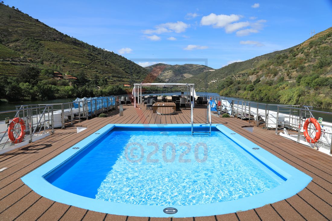 Das weitläufige Sonnendeck ist mit geschmackvollem Kunstrasen in Holzoptik, sowie einer Vielzahl an Sonnenliegen und Stühlen ausgestattet. Eine Besonderheit ist, dass die Kommandobrücke im vorderen Bereich vom Oberdeck installiert ist und nicht, wie auf den meisten Flusskreuzfahrtschiffen üblich, auf dem Sonnendeck. Dadurch genießt man von allen Bereichen des Sonnendecks aus einen freien Blick auf die abwechslungsreiche Landschaft entlang des Douro. Trotz der geringen Schiffslänge fällt der Swimmingpool auf dem Douro Cruiser überraschend groß aus. Vergleichbare Pools kenne ich sonst nur auf großen Flusskreuzfahrtschiffen die deutlich länger sind. Wer Schatten bevorzugt, findet ein Sonnensegel auf dem Sonnendeck. Das Sonnendeck punktet in vielerlei Hinsicht und erstreckt sich nahezu über die gesamte Schiffslänge.