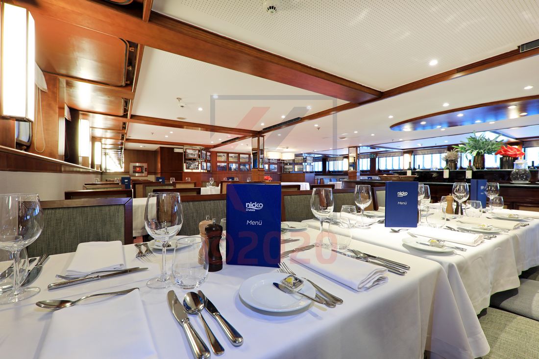 Das Panorama-Restaurant überzeugt mit harmonischen Farben und einem angenehmen Ambiente. Mittig angeordnet ist eine große Buffetstation, die zum Frühstück auch als solche genutzt wird. Aufgrund der derzeitigen Situation und den entsprechenden Hygienevorschriften werden alle Speisen einzeln portioniert und abgedeckt. Mittag- und Abendessen werden, mal von speziellen Themenabenden abgesehen, als mehrgängige Menüs serviert. Die Auswahl erfolgt aus einer täglich wechselnden Speisekarte. Für den kleinen Hunger besteht mittags die Möglichkeit, Sandwiches zu bestellen. Zahlreiche Mitarbeiter des Küchen- und Restaurantteams sorgen täglich für das leibliche Wohl der Reisegäste an Bord und zaubern köstliche Mahlzeiten von früh bis spät. Der Zugang zum Restaurant erfolgt über das offene Haupttreppenhaus bzw. den Fahrstuhl, welcher die Kabinendecks miteinander verbindet. Der Fahrstuhl ist derzeit gehbehinderten Personen vorbehalten.