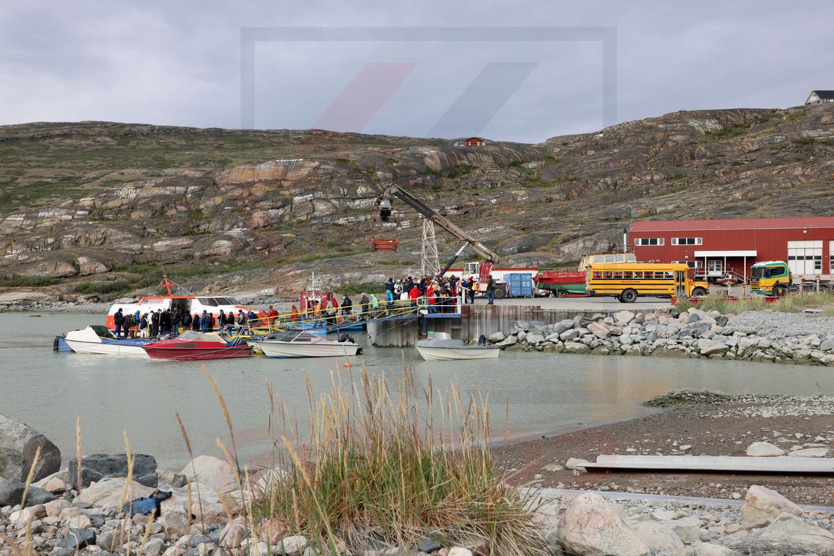 Der kleine Ort Kangerlussuaq zählt im Sommer rund 500 Einwohner, im Winter die Hälfte. Der Name bedeutet „der lange Fjord“ und das ist er, mit genau 163km. Der Ort Kangerlussuaq liegt etwa 130km vom Meer entfernt, das Inlandeis befindet sich in etwa 30km Entfernung. Bis zum kleinen Hafen von Kangerlussuaq müssen ca. 10km zurückgelegt werden. Der Flughafen wird trotz der einfachen Infrastruktur vor Ort gerne für einen Passagierwechsel genutzt. Er muss nämlich nur äußerst selten wetterbedingt geschlossen werden. Ganz anders als der Airport der Hauptstadt Nuuk. Außerdem ist die Landebahn in Kangerlussuaq bedeutend länger. Da aufgrund des niedrigen Wasserstandes kein Schiff im Hafen anlegen kann, werden alle Gäste mit Tenderbooten zu den vor Anker liegenden Kreuzfahrtschiffen gebracht. So auch zur HAMBURG, die ebenfalls im Fjord ankert.
